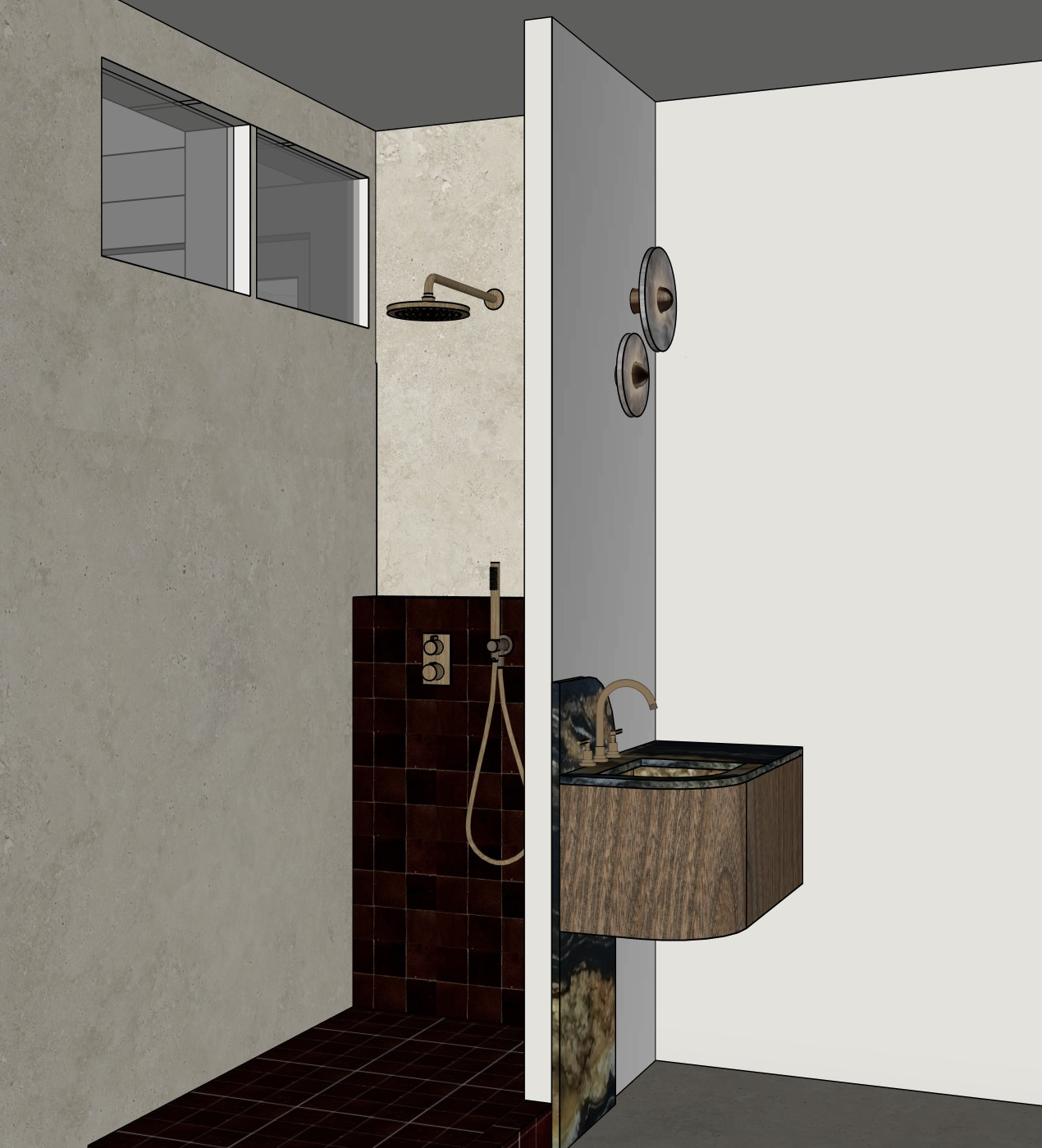 the walls in the shower are covered with marazzi mystone tivoli beige tiles the wall lights are median model from apparatus in alabaster the dark stone is black fusion quartzite the fixtures are in bronze the small square tiles are zelige in dark bordeaux tiles like this https www terredezellige com produit mosaique terre de zellige 3x3 cm sur plaque de 30 5x30 5 cm 07 marron fonce the small wall behind the vanity and wall lights is fully in mirror there are no handles on the wall nor on the furniture what can be seen in the mirror is a light beige wall the bathroom is on the 6th floor the floor under the vanity is in the marazzi mystone tivoli beige tiles