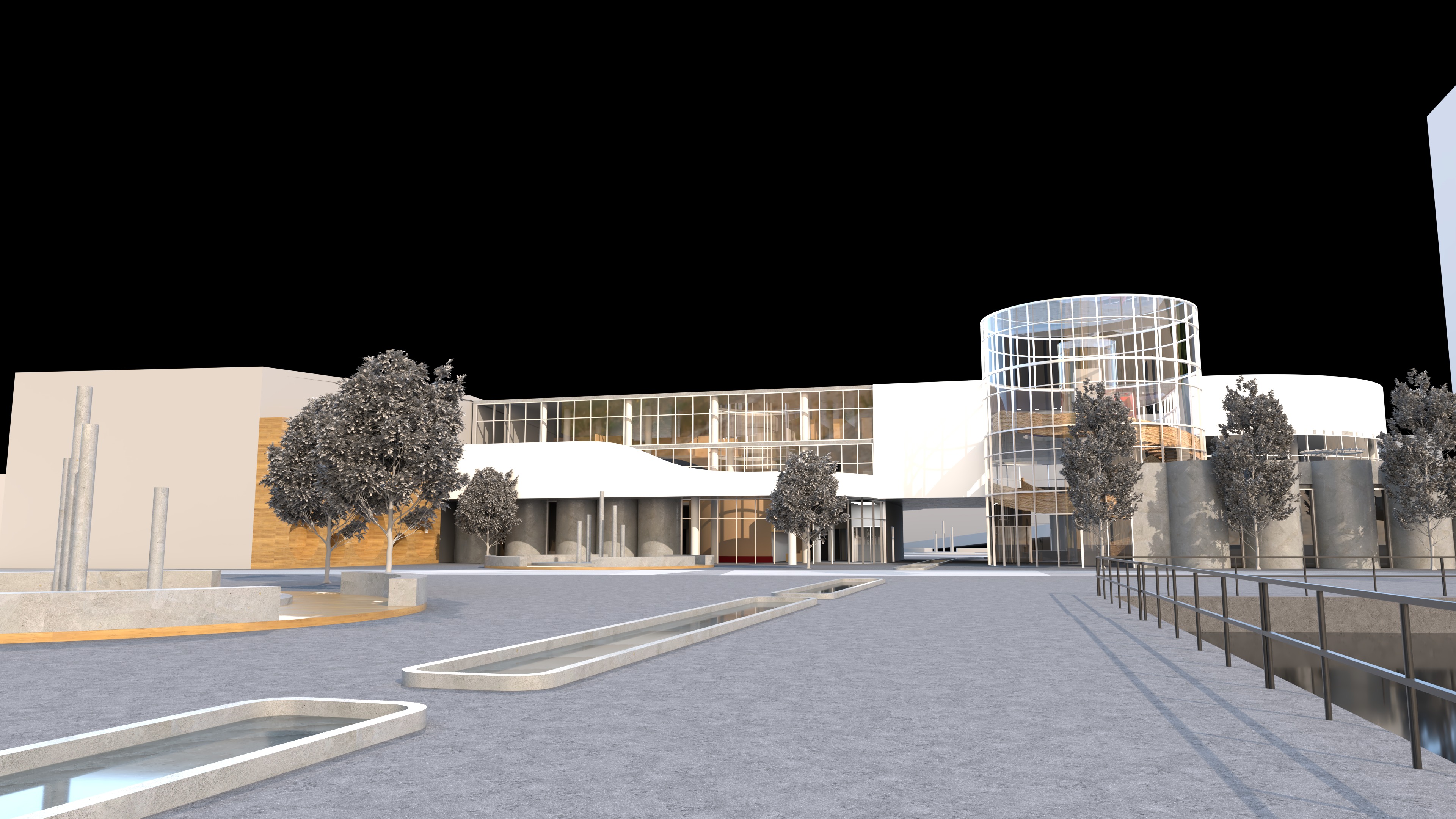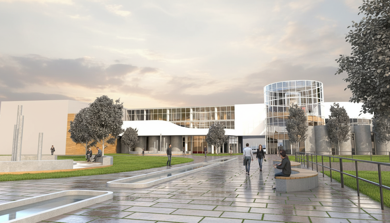 contemporary exterior shot use the input image as the base image this is a modification task not a redesign task absolute priority preserve the original architecture exactly as shown in the input image do not modify the building the cylindrical concrete volumes the fa ade composition the openings the railings the layout the geometry the camera angle the framing or the architectural design in any way do not redesign reinterpret enhance restyle or change the architecture only apply the requested site and atmosphere modifications the project is a contemporary library the cylindrical concrete volumes are the main architectural concept and must remain exactly unchanged ground material clarification green areas must become realistic textured lawn main ground surfaces must become rectangular paving stones circular ground areas must remain natural wood decking the seating integrated in the circular areas must remain concrete apply only these modifications replace all green ground surfaces with realistic textured grass make all trees naturally green and realistic replace the main hardscape ground surfaces with rectangular paving stones add a subtle after rain effect on the exterior ground surfaces only wet surfaces should be realistic and soft with light reflections only do not exaggerate the reflections add a coherent realistic sky consistent with an after rain atmosphere soft daylight natural clouds realistic brightness add several realistic human figures enjoying the space natural activities such as walking sitting talking and occupying the outdoor public space use correct scale and perspective produce a realistic professional architectural render accurate materials realistic light soft shadows clean atmosphere do not do not modify the building do not change the architecture do not change the cylinder forms do not change the fa ade do not change the windows do not change the curtain walls do not change the wood circular zones do not change the concrete seating do not change the geometry do not change the composition do not change the viewpoint do not add new architectural elements do not remove any architectural elements if any instruction conflicts always prioritize preserving the original architecture exactly le truc important avec archsynth plus tu en dis sur l architecture plus il pense qu il peut la retravailler donc maintenant tu gardes une mini description tu r p tes plusieurs fois qu il ne doit rien toucher tu s pares clairement architecture et site encore plus s curitaire tu peux m me commencer par cette ligne seule avant le prompt do not modify the building in any way only modify landscape atmosphere and occupancy a aide beaucoup version encore plus courte si tu veux quelque chose de plus brutal et efficace keep the building exactly unchanged do not modify architecture geometry fa ade openings materials camera or composition only change the landscape and atmosphere textured grass green trees rectangular paving stones realistic after rain effect coherent sky and several realistic people occupying the space keep the circular wood ground areas and concrete seating exactly as they are produce a realistic professional architectural render architecture
