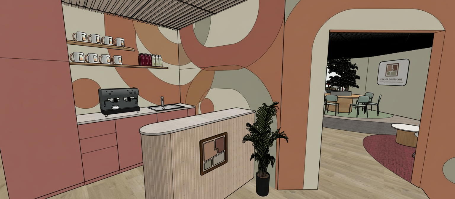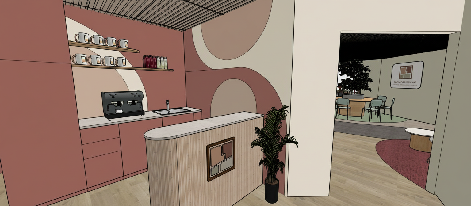 vibrant creative workshop photography furniture dynamic flexible layout white training tables pushed into two large island clusters one cluster 6 tables pushed together as large collaborative surface one cluster 3 tables in l shape remaining tables folded against wall showing casters black stacking chairs arranged freely some at tables two stacked in corner one chair turned backwards occupant straddling it casually space creative agency workshop studio exposed brick wall warm terracotta left side one wall floor to ceiling pegboard colorful sticky notes mind maps printed images reference sheets covering entirely industrial black steel windows large format afternoon light shadow patterns on floor raw concrete ceiling exposed steel beams black track lighting with colored accent leds warm oak plank flooring table surfaces workshop chaos large sheets of paper with sketches markers in every color scattered macbooks showing design software printed mood boards and color swatches coffee cups snack wrappers genuine working sticky note clusters on table surfaces wire baskets overflowing with materials people 10 creatives in full workshop facilitator standing at sticky note wall woman natural hair colorful blazer pulling and rearranging notes animatedly two people at large island table leaning over sketches together pointing and discussing excitedly man at l shape table standing presenting from laptop to three seated hands moving energetic explanation three others at various points one photographing wall with phone one drawing in large sketchbook rapidly one on floor with large paper layout two in background at standing position deep in bilateral discussion plants oversized rubber tree in black iron planter brick wall corner glossy dark leaves trailing pothos from industrial pipe shelf above cactus collection on window ledge terracotta pots various forms air plants pinned artfully to pegboard lighting afternoon industrial window light track lighting supplementing overhead warm brick reflecting amber into space colorful sticky wall adding visual energy neon sign on brick soft coral glow color palette white tables black chairs brick terracotta warm oak floor full color sticky wall coral neon style ideo design sprint 8k creative chaos with underlying energy ar 16 9 style raw stylize 250 q 2