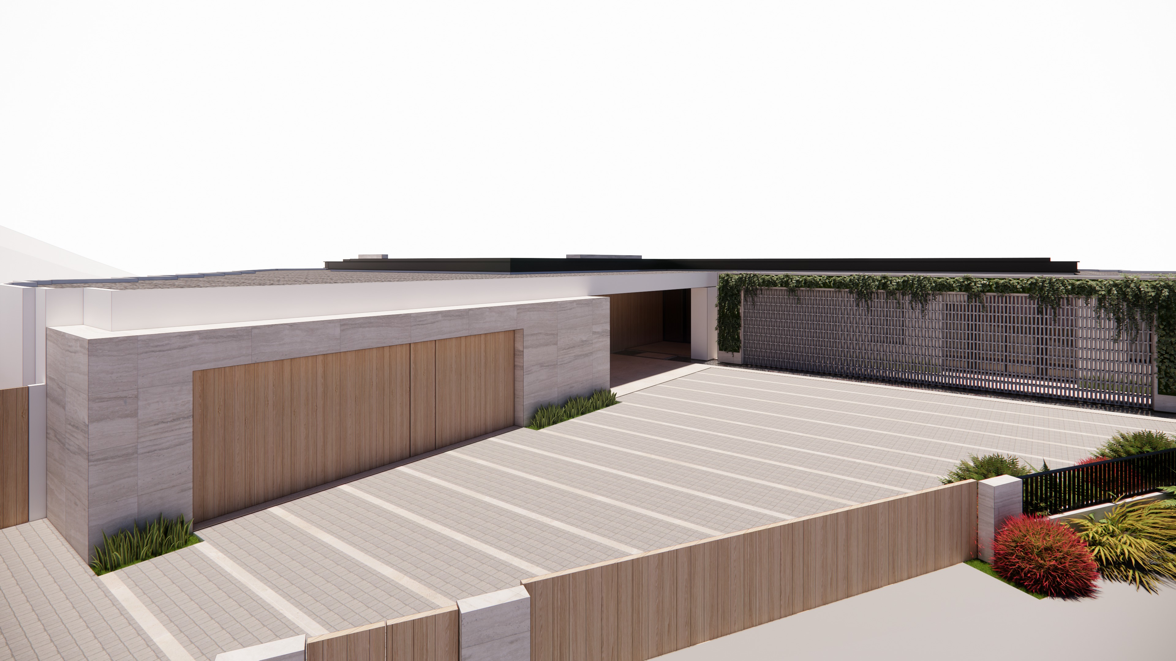 create a photorealistic rendering do not change the view angle this is the entry driveway it has a long wood panel sliding entry door from the street 42 high the driveway is made of gray cobblestones with limestone stripes the garage has travertine stone tile finish and wood panel doors with planters on each side of the wood panel doors the planters are not raised but rather aligned with the floor level on the right side there is a long and tall travertine stone wall with an opening that is filled with rectangular breeze blocks this wall is covered with plants green wall this wall sits on a shallow water feature the water feature continues beyond into the covered area this covered area is flat no steps don t add any labels
