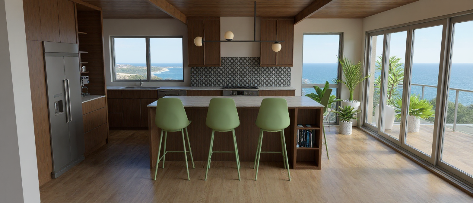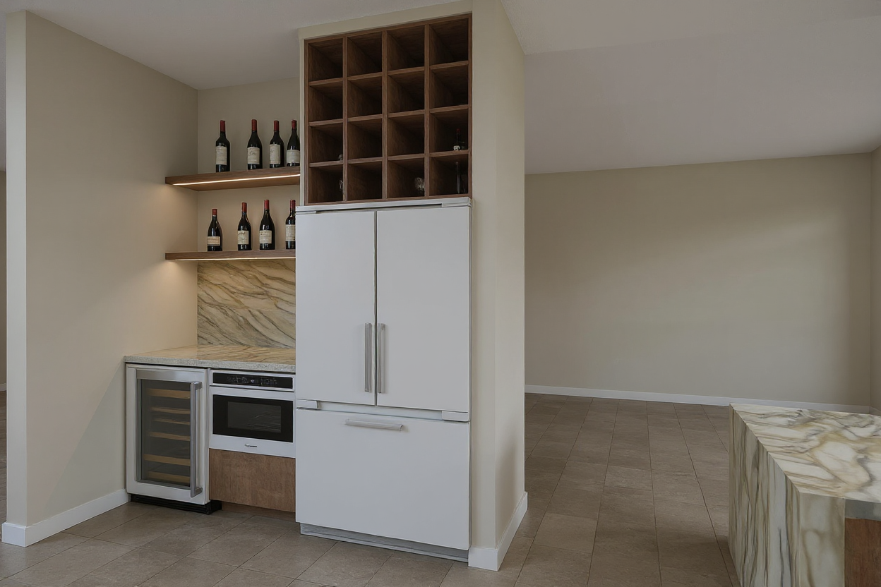 realistic rendering of this sketchup view of a luxury wet bar furniture is made by light warm tone stained oak cabinets bronze hardware marble splash with undercabinet lighting and gold faucet