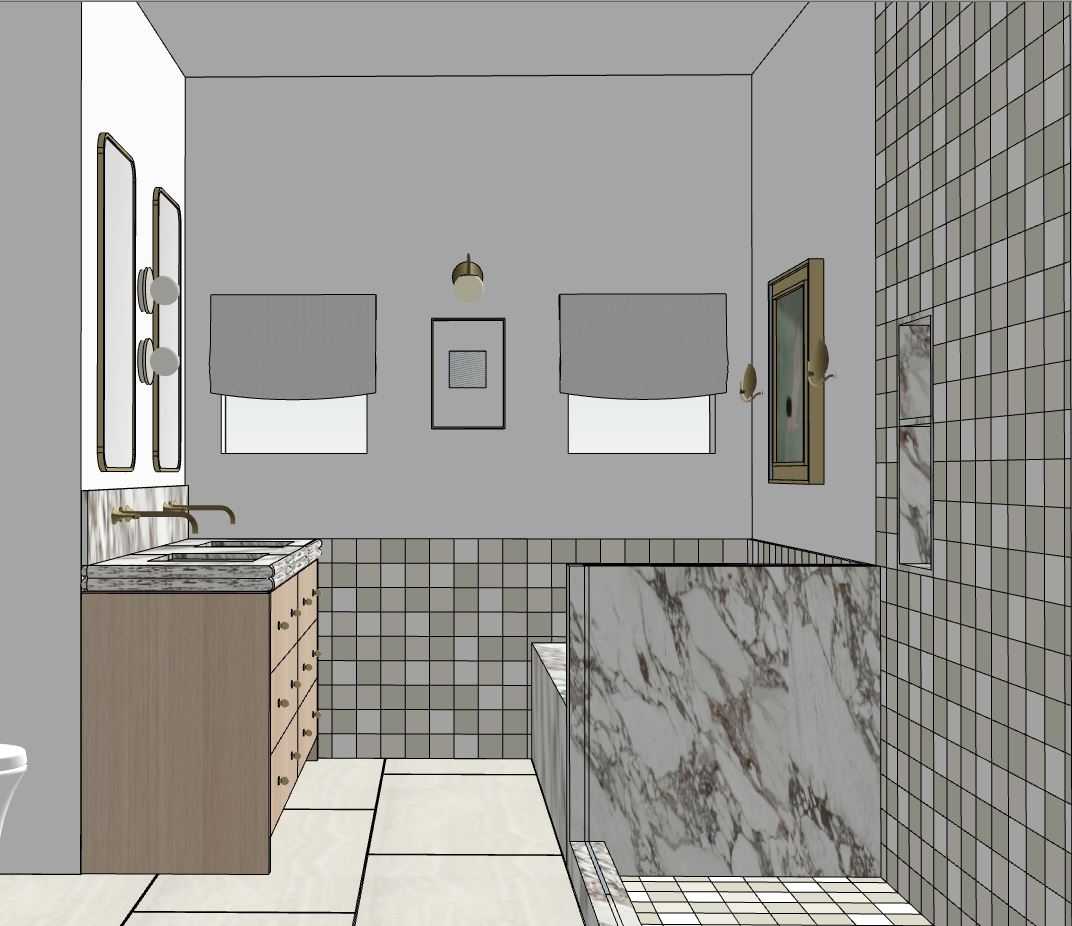 create a photorealistic rendering of this bathroom with soft warm indirect lighting