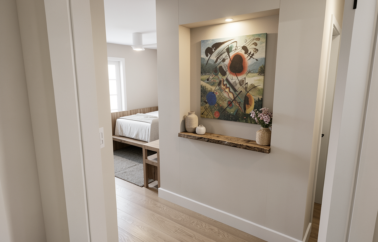 render a calm primary bedroom entrance with a wall niche that houses a calm landscape painting incorporate a white oak wooden shelf at the niche counter base include calm neutral decor elements like some candles a book and a plant use soft lighting with a natural hue to create a cozy and inviting atmosphere make the painting a framed landscape painting