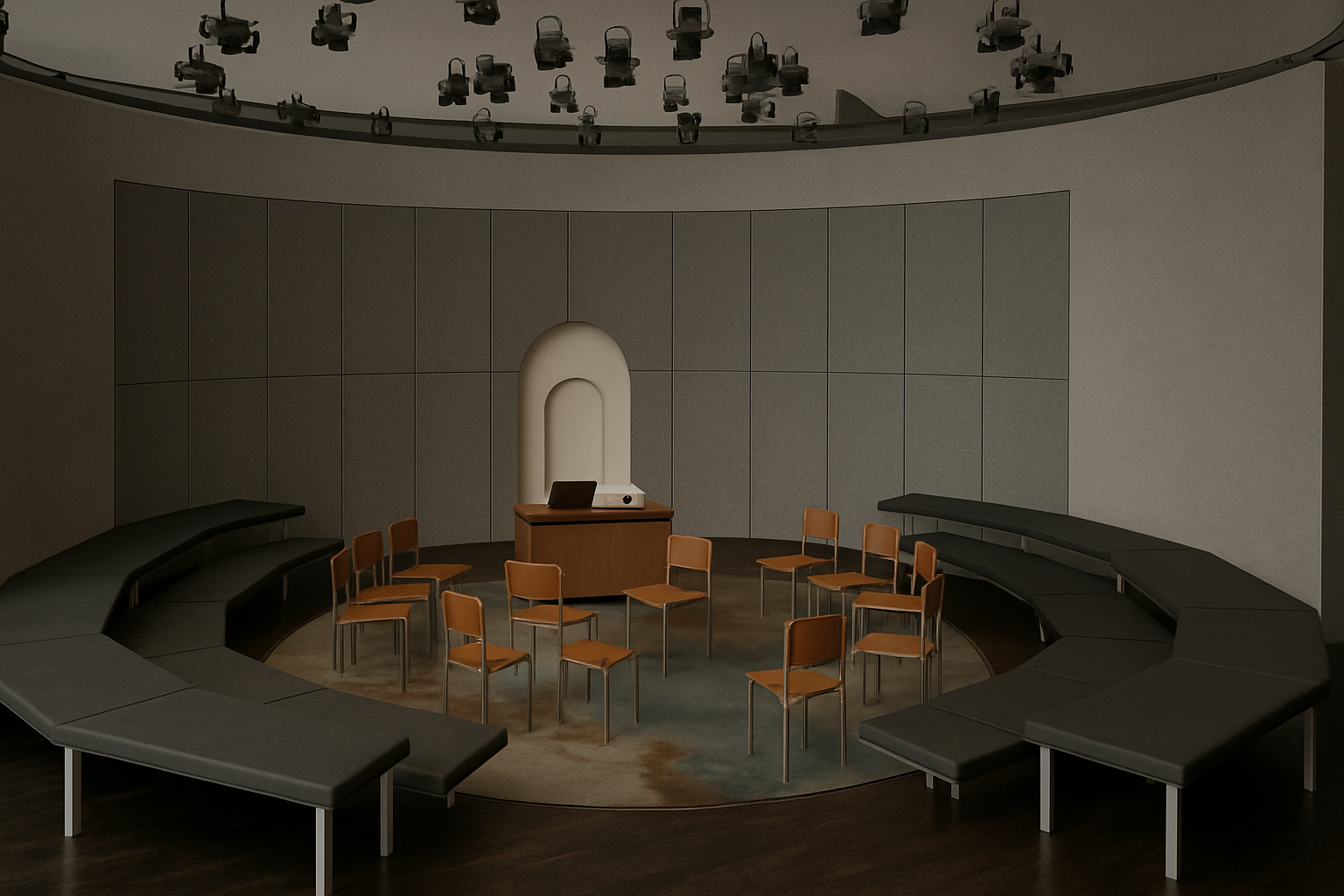 interior shot add dramatic top light from the ceiling this is a theater set dramatic shadows