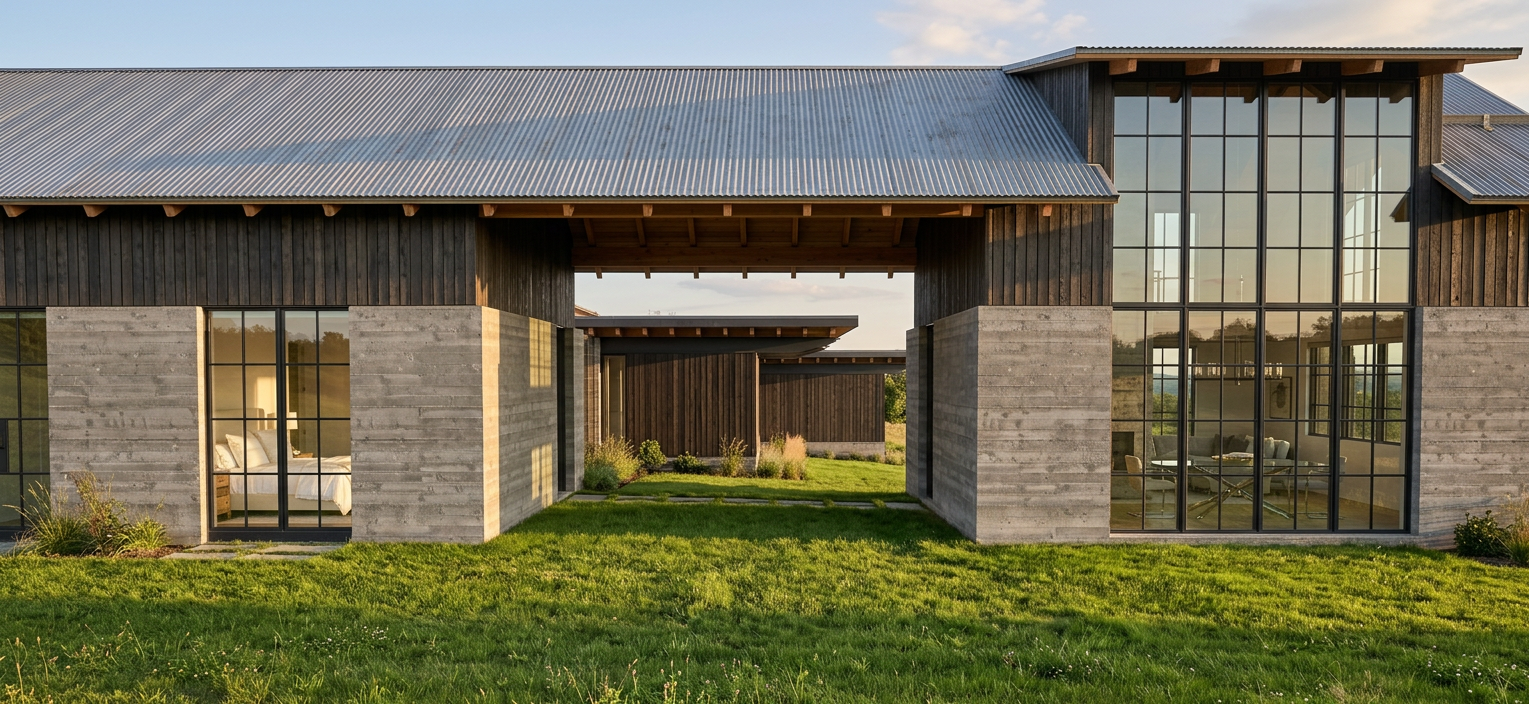 enhance realism and lighting quality only preserve original elevation geometry and composition exactly no redesign materials white horizontal siding with soft warm undertones not stark white black window frames with subtle reflectivity maintain all original window placements and proportions doors convert central rear doors to large sliding glass doors with slim black frames highly transparent glass minimal mullions steps replace entry steps with light natural stone limestone or soft gray stone clean edges slightly matte texture lighting soft late afternoon golden hour sunlight warm directional light casting gentle realistic shadows across facade even exposure no harsh contrast subtle ambient sky light slightly warm white balance creamy whites not blue windows soft warm interior glow visible 2700k realistic glass reflections no overexposure rendering style photorealistic high end residential photography natural color grading soft shadows no over saturation no dramatic contrast no stylization environment minimal clean lawn subtle landscaping only if needed no added architectural elements