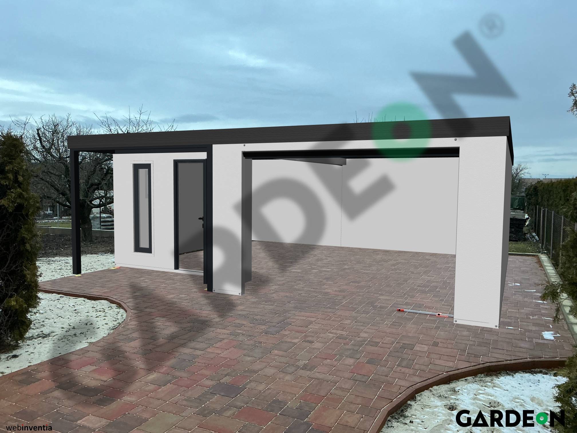 please make this garage more realistic realistic grass instead snow and park real bmw car inside with shelves on rear side of garage full of garage equipment