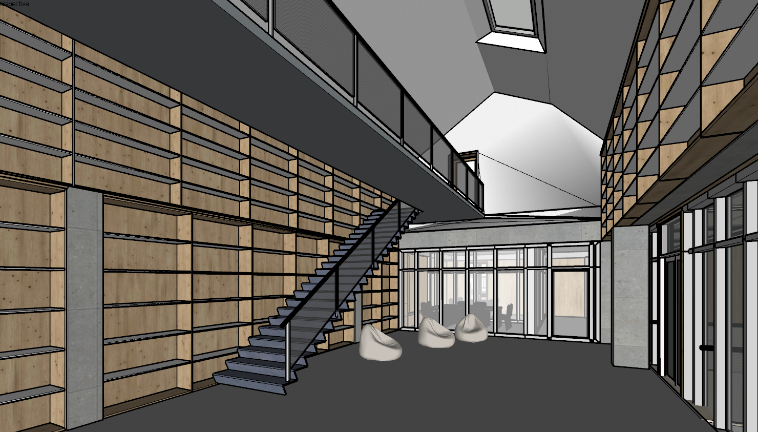 modernist interior shot i want you to render it with soft materials for a school library adding books on shelves light from above from the ceiling window architecture