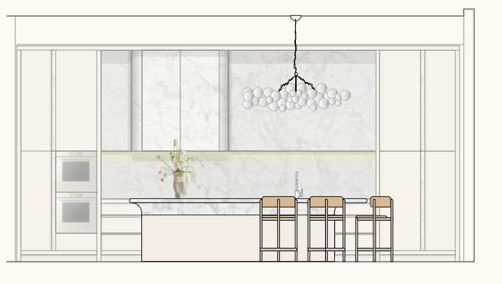 white luxurious marble features on benchtop over head cupboards and handle detail the island has a special detail underneath both benchtops have thick full bull nose benchtops cooktop and sink on rear bench beige polyuthrane and marble white beige microcement floor