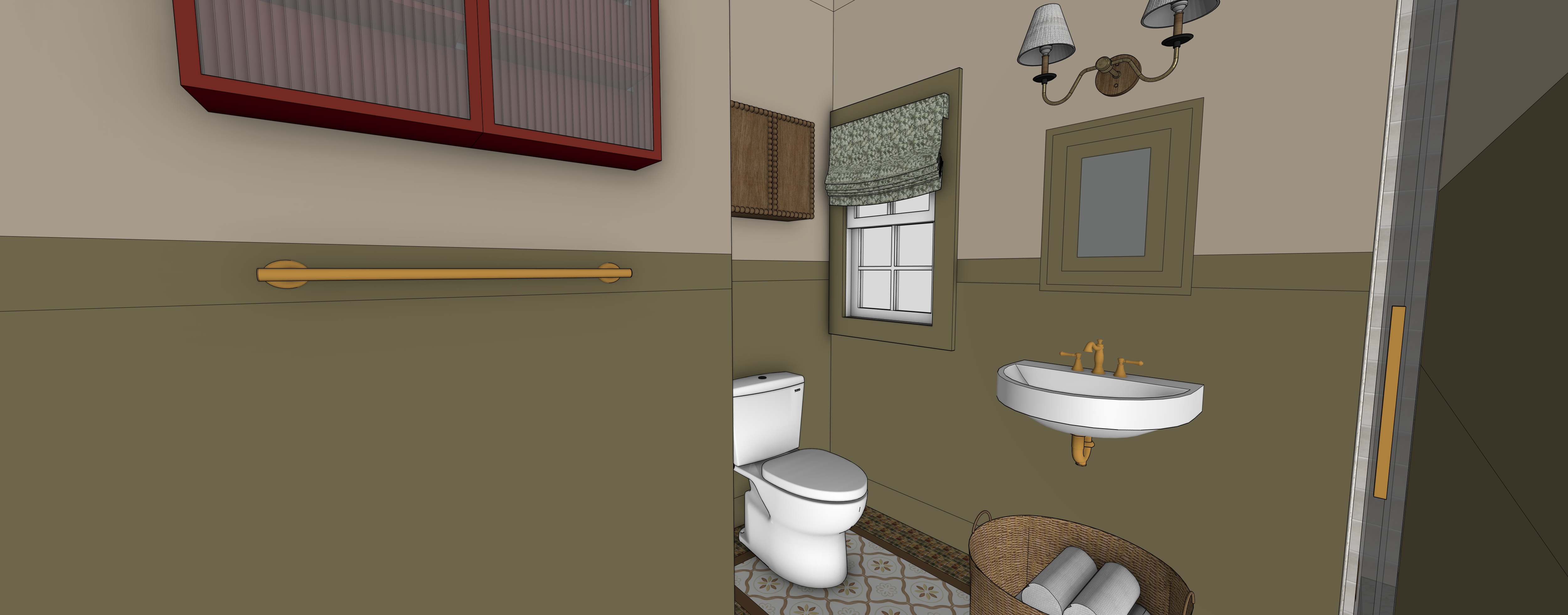bathroom with two tone wall color patterned tile in the middle of floor maintain all colors patterns and layouts only make look more realistic with lighting and a slightly glossy texture on tile add realistic lighting at vanity sconce add gentle ambient overhead lighting like from a recessed can light add gentle natural light from the window
