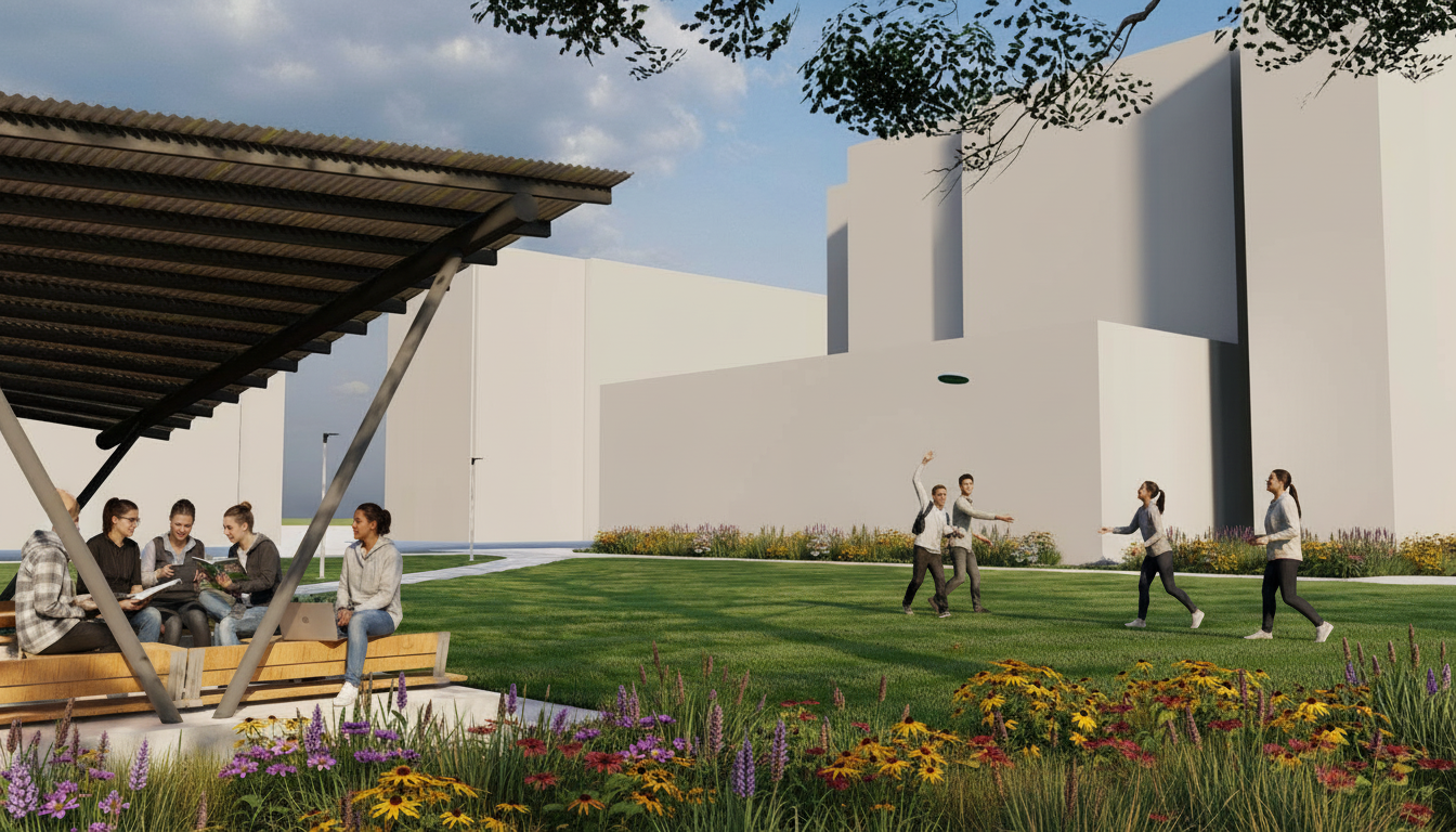 don t change background show students playing frisbee in lawn plants beds shall be native iowa short grass prairie