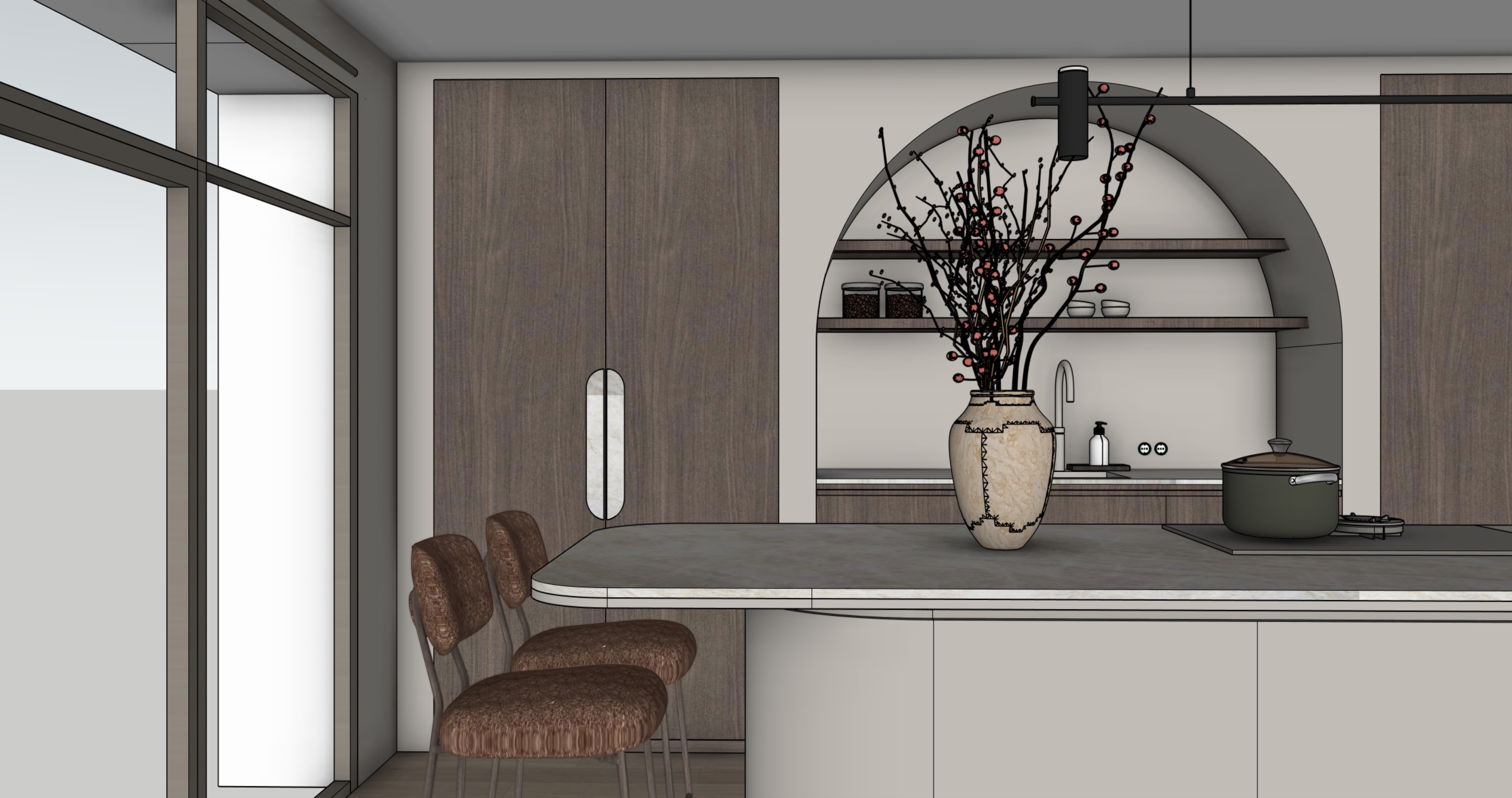 make the kitchen countertop in taj mahal stone matching the oval handles on the tall cabinets and paint the bottom part in beige miral paint install an led strip under the shelves and make the glass less glossy