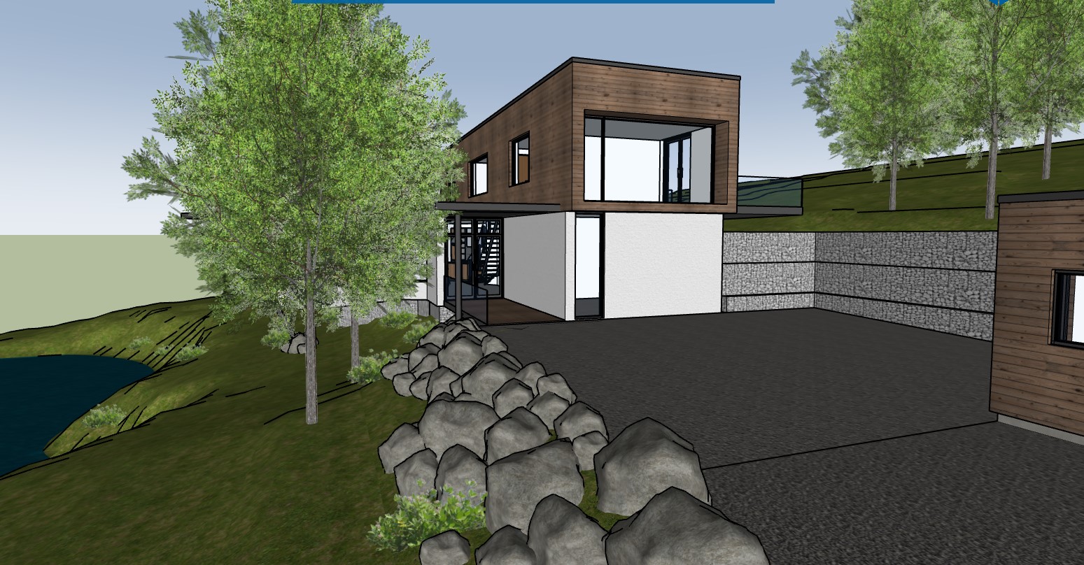light grey gravel drive crips white render lower walls and horizontal larch cladding upper walls