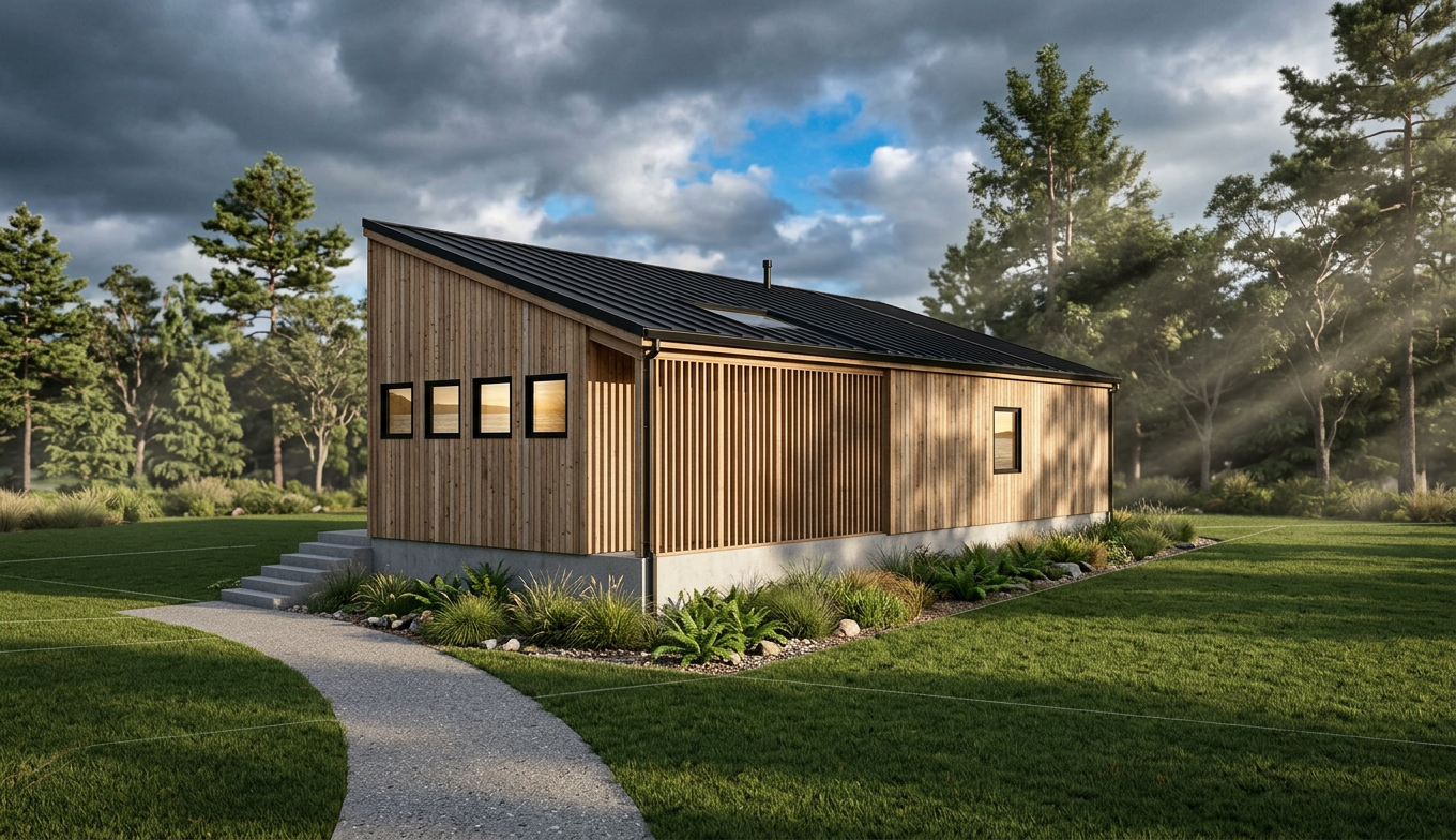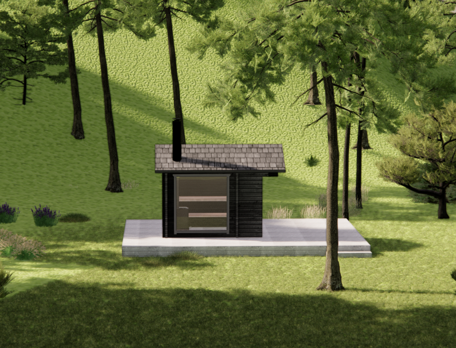 render a photorealistic 3d perspective of this sauna the current material style current material colour keep model geometry the same windows doors roof walls make a green meadow with moss several pine trees looks native to swedsih forest do not change relief do not change the view only enhance the current materials and make the landscape nicer vegetation detailed textures in the wood siding and a vibrant clear sky with light atmospheric depth render in hyper realistic architectural visualization quality 8k resolution