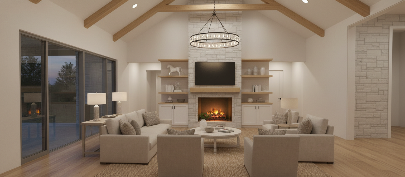 showroom concrete floor white walls black ceiling track lights double height make the side tables smaller make the consol bigger make the art work all the wall size place the consol in the entrance to the living room