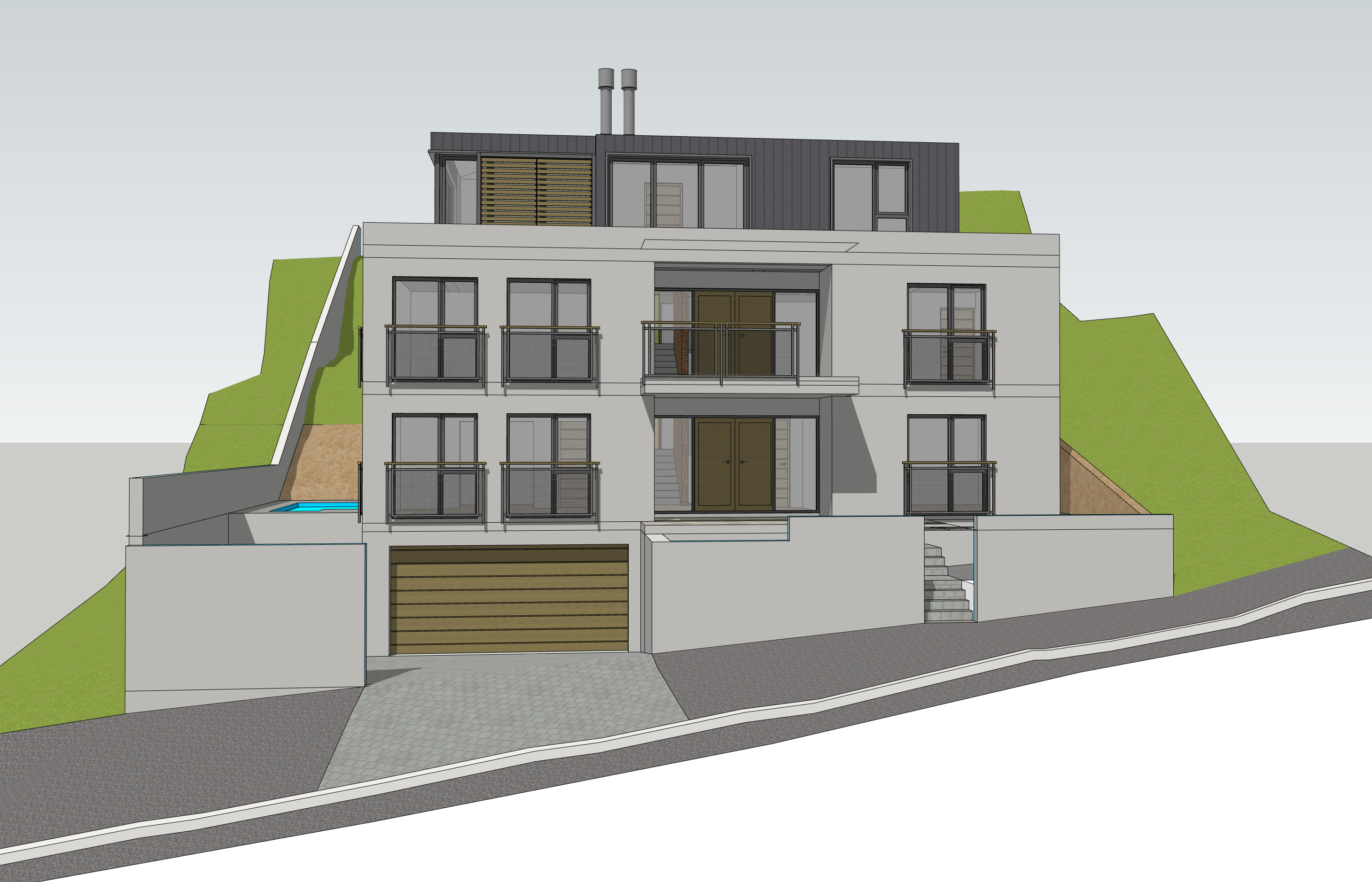 modernist exterior shot modern minimalist house on a hillside sleek white facade with contrasting dark grey for the top floor and window frames lush green grass on the hill adding a natural touch wooden garage doors and balcony accents in warm oak brown crystal blue water in a small pool on the left side light stone pavement in front creating a sophisticated and serene atmosphere bright and sunny sky casting soft shadows for a peaceful ambiance architecture