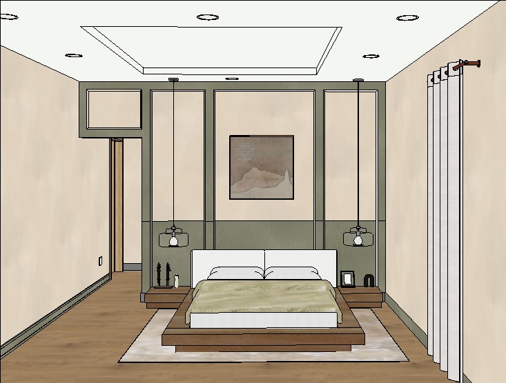 photorealistic interior render of a contemporary bedroom strictly match the original design layout proportions materials and furniture placement exactly as shown in the reference image do not modify reinterpret or add new elements the room features a symmetrical composition with a central bed placed against a paneled accent wall the wall has vertical molding divisions with a two tone finish upper panels in warm light beige and lower panels in muted sage green a centered artwork is placed above the bed the bed has a low profile modern frame in light upholstery with layered neutral bedding in soft beige and green tones two identical wooden nightstands sit on each side of the bed each styled minimally with decor above each nightstand a pendant light hangs from the ceiling aligned symmetrically maintain exact positions scale and drop height the ceiling includes a recessed tray ceiling with integrated cove lighting and evenly spaced recessed downlights add subtle warm led lighting inside the ceiling cove for a soft indirect glow flooring is warm toned wood with a large neutral area rug placed under the bed on the right side include full height curtains in a light fabric softly draped from a ceiling mounted rod on the left side maintain the vertical architectural feature and mirror element exactly as shown lighting should be soft warm around 3000k 3500k realistic and balanced emphasize natural shadows and material textures materials must appear realistic matte painted walls soft fabric upholstery natural wood grain and subtle metal finishes no glossy or exaggerated reflections camera angle straight on frontal view centered on the bed eye level perspective maintain original framing and proportions ultra high resolution portfolio quality render highly detailed textures global illumination soft shadows ambient occlusion and realistic light behavior