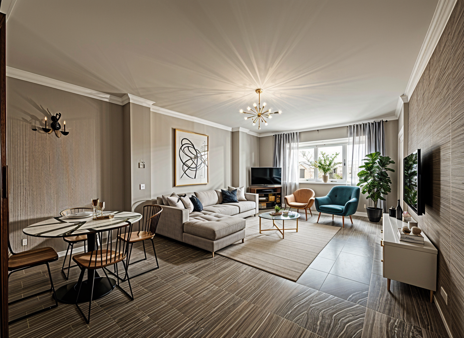 modernist interior shot please make a moder living room with pale colours and a touch of gold nice lighting and comfy space architecture