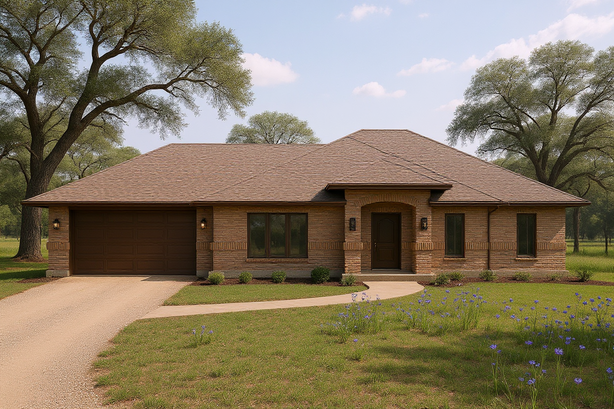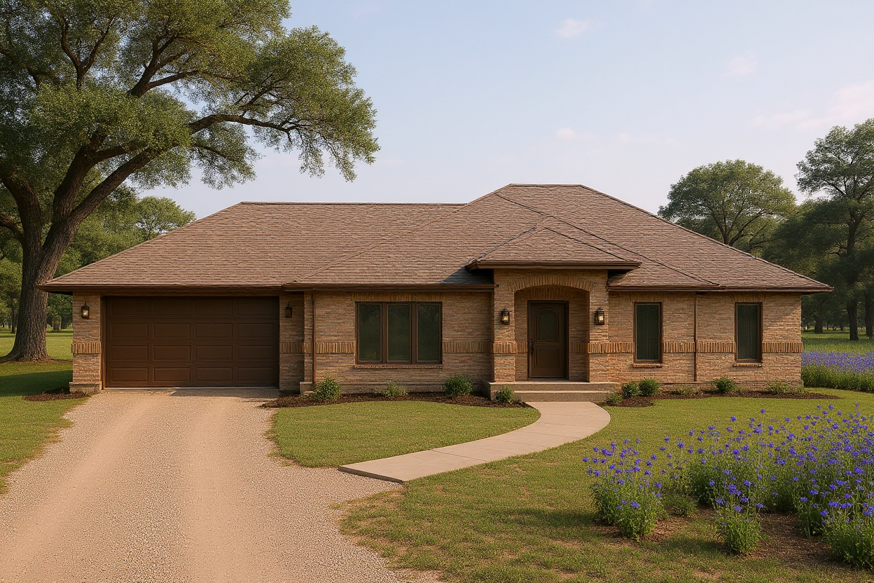 texas farm land setting with medium height foundation planting mottled brown roman brick bronze paint on doors windows fascia cream colored window frames oak trees in yard taper walk up to front porch gravel drive to garage door infill yard with fields of blue wildflowers in yard ramp sidewalk up to front porch ledge at base of house is concrete wall lights both sides of garage door sunset with interior lighting no window mullions in right windows