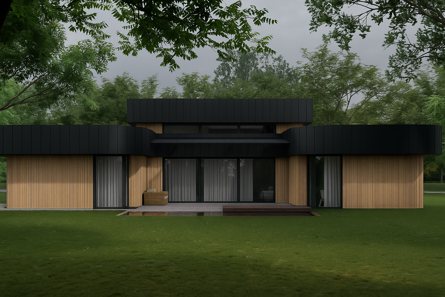 exterior shot modern minimalist single story house with a flat roof rendered beautifully in a vibrant and natural setting the walls feature a warm terracotta color with a smooth texture the roof and window frames are a sleek dark charcoal gray providing a sophisticated contrast the house is surrounded by lush green grass that is rich and vibrant the outdoor area includes a minimalist patio with elegant furniture in matte black and rich brown wood a clear blue sky creates a serene and inviting atmosphere the overall ambiance is peaceful and harmonious with a perfect balance between modern architecture and nature