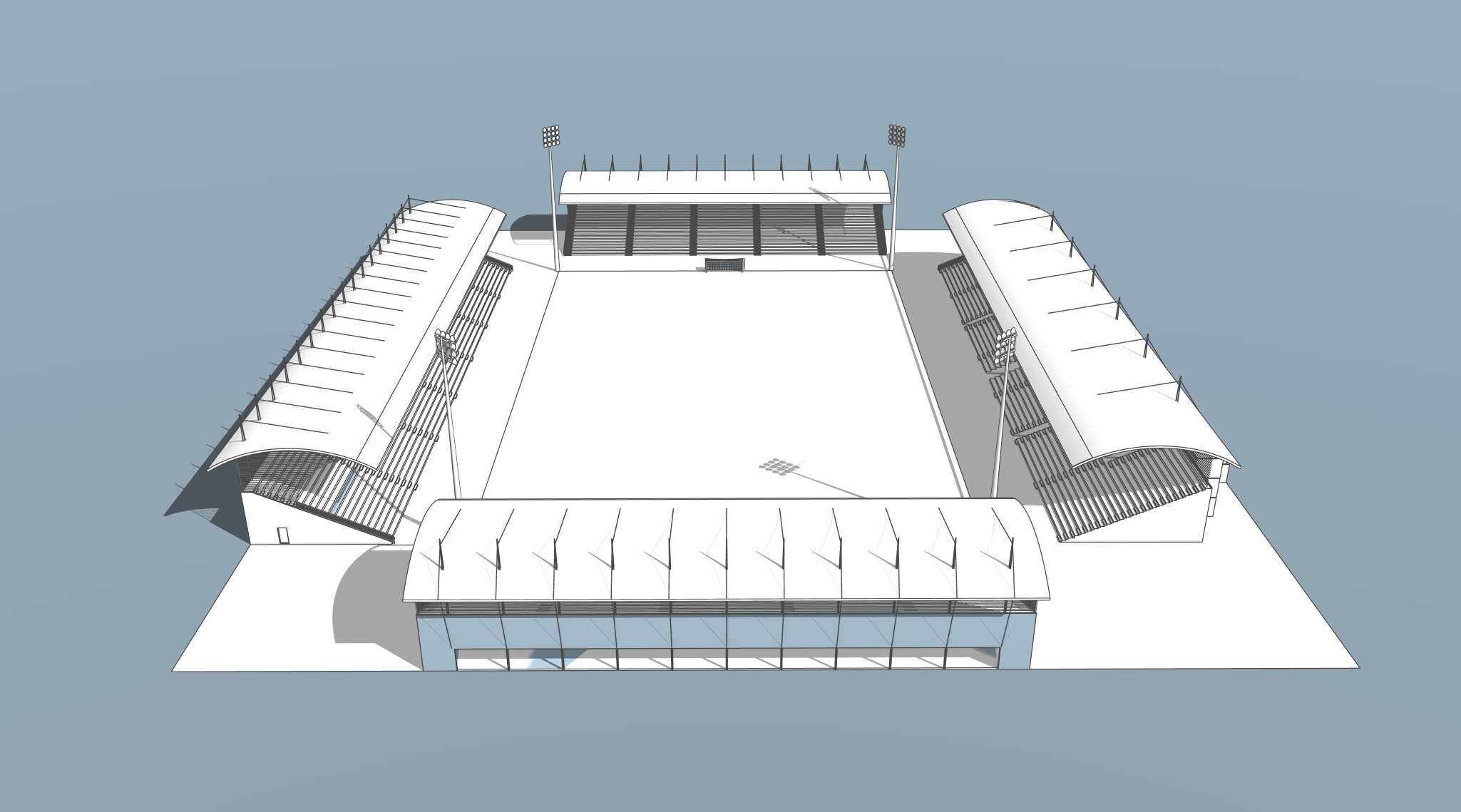 create a vibrant rendering of a modern stadium complex the stadium features sleek arched roofs covered in bright white with hints of metallic silver reflecting sunlight the stands are filled with rich dark grey seating contrasted by a lush field of vivid green the surrounding area is paved in smooth light grey concrete tall stadium lights with metallic poles accent the corners casting soft shadows the sky is a gradient from deep clear blue at the top to a lighter teal near the horizon giving a warm sunny late afternoon atmosphere