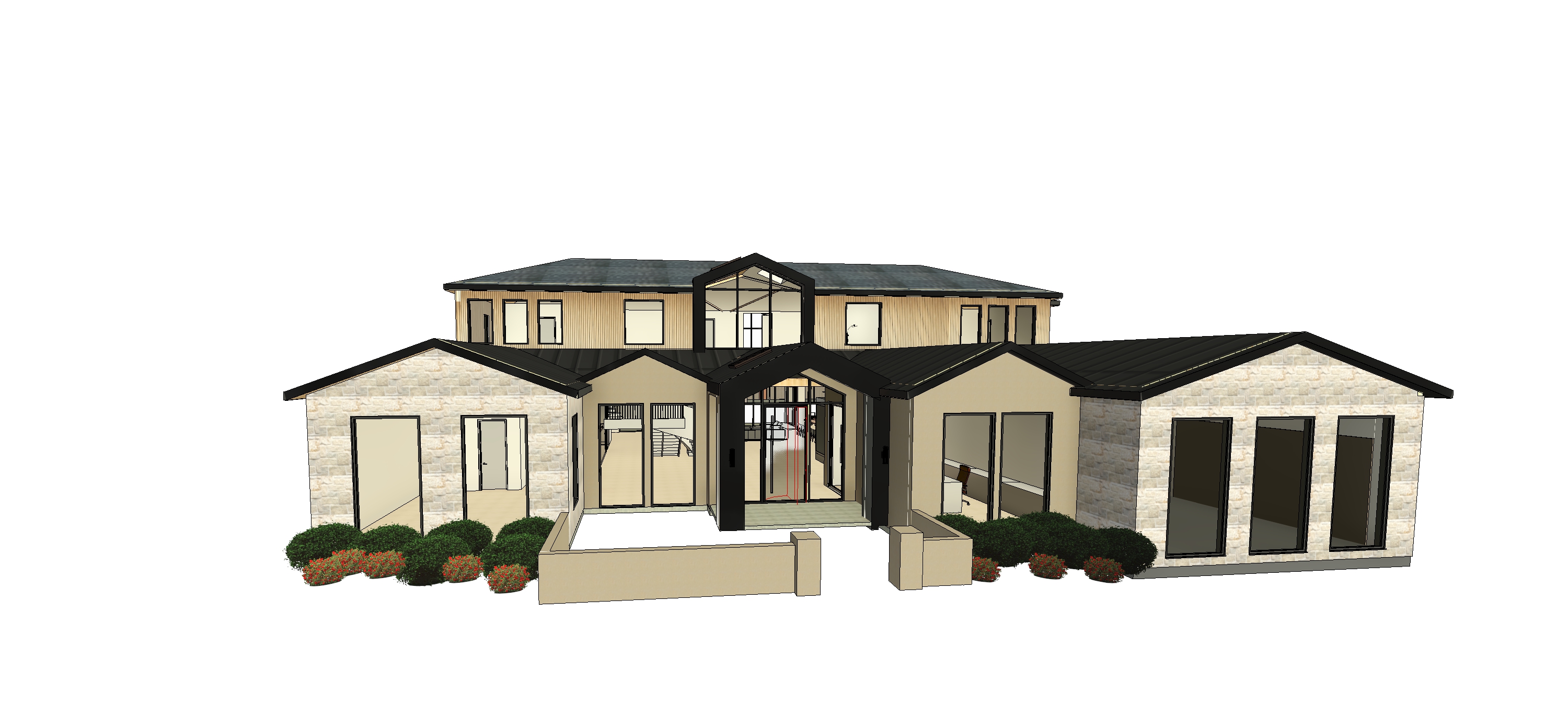make upper roof black shingles add pavers and driveway in the front more natural tone outdoor shot make all the window and door frames black add more plantings around the pavers less trees in the back