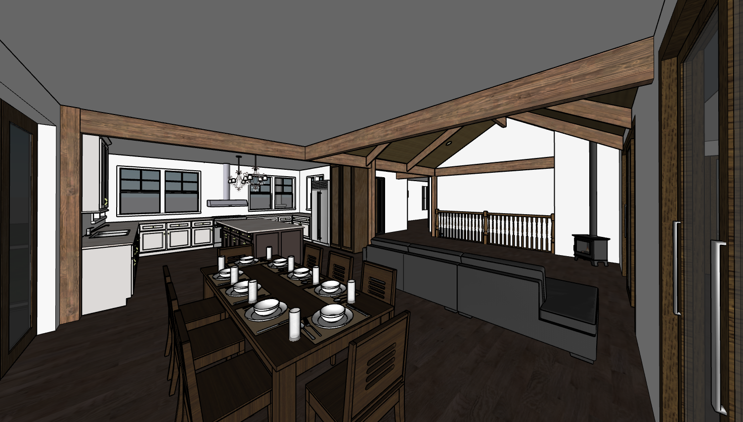 render a rustic and cozy open plan dining and living space with warm natural tones the dining table is made of deep walnut wood adorned with white porcelain plates and silver cutlery chairs are a matching walnut finish the walls are a soft cream complemented by exposed wooden beams in rich oak the flooring is dark hardwood creating a contrast with a plush charcoal gray sectional sofa in the living area kitchen cabinets are a muted cream with brushed nickel handles and the countertops are polished granite large windows with soft white curtains let in natural light enhancing the warm and inviting atmosphere a wrought iron chandelier hangs above the dining table to add elegance while a cast iron stove in matte black provides a cozy touch