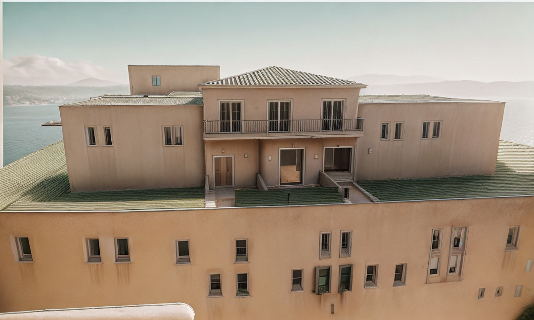 roofs and recessed facade bays to be green oxide plinth to be coarse stone as in american lodge add window shutters in the recesses photo realistic style add some nice clouds to the sky cars to be more family type architecture