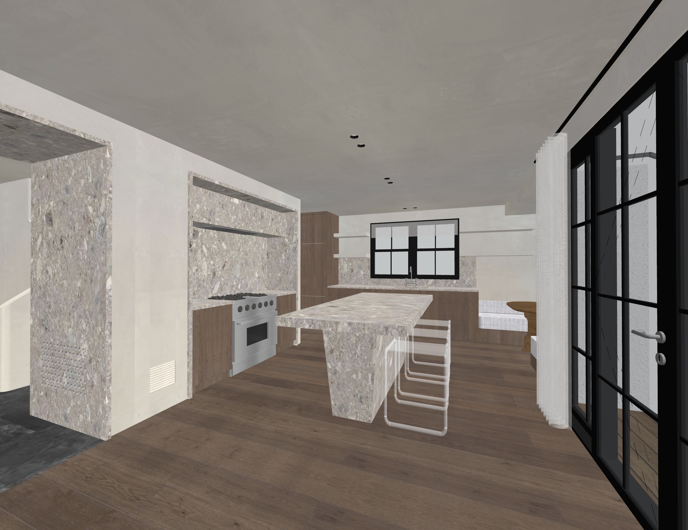 using the provided image as the exact base model create a fully photorealistic contemporary kitchen interior do not alter move redesign or reinterpret any architectural geometry millwork layout island proportions appliance placement window door locations or camera perspective preserve the exact composition and viewpoint lighting mood render in soft natural daytime lighting with diffused sunlight entering from the right side glass doors and rear window balance natural light with subtle recessed ceiling downlights 3000k for a warm neutral tone create gentle shadow gradients and realistic light falloff across the floor and cabinetry avoid harsh contrast aim for a calm refined residential atmosphere materials finishes countertops backsplash and island terrazzo or heavily aggregated stone with varied chip sizes ensure high resolution texture natural randomness and a honed finish with soft reflectivity island monolithic with crisp geometry add subtle edge softening and micro imperfections for realism cabinetry warm medium tone wood veneer with visible grain matte satin finish floor wide plank hardwood in a warm brown tone with natural variation subtle wear and low gloss sheen walls ceiling smooth off white plaster gypsum with soft light diffusion window door frames matte black metal with realistic reflections and slight edge wear hardware fixtures brushed stainless steel or matte black finishes furniture styling replace placeholder stools with realistic modern bar stools powder coated metal frames minimal design add restrained high end styling a ceramic bowl with fruit a wood cutting board a linen towel a small plant near the window keep surfaces mostly clean and uncluttered for a high end editorial look glass reflections ensure accurate reflections and refraction in glazing add slight imperfections fingerprint smudges subtle dust and micro scratches for realism appliances upgrade the range and fixtures to high end stainless steel appliances with realistic brushed texture and soft reflections rendering quality physically accurate materials pbr workflow ray traced global illumination soft shadows and realistic ambient occlusion maintain true to life color balance and exposure no overblown highlights ultra high resolution architectural visualization quality camera keep the exact camera position and focal length slight depth of field for realism while keeping key elements sharp overall mood warm modern understated luxury clean tactile and highly livable with a focus on material richness and natural light