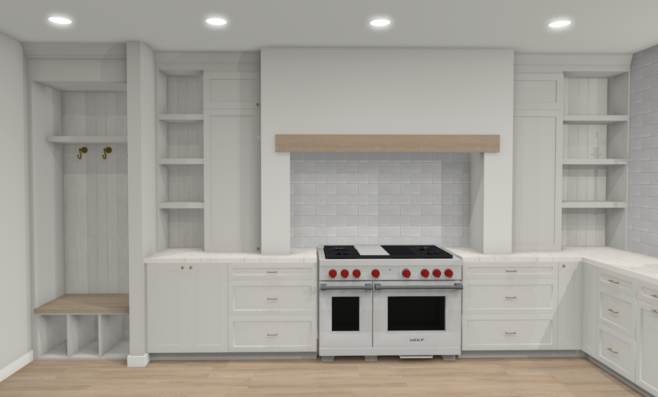 even lighting through the whole image white vertical panels behind all shelves and behind the bench on the left the panels should have a matte finish
