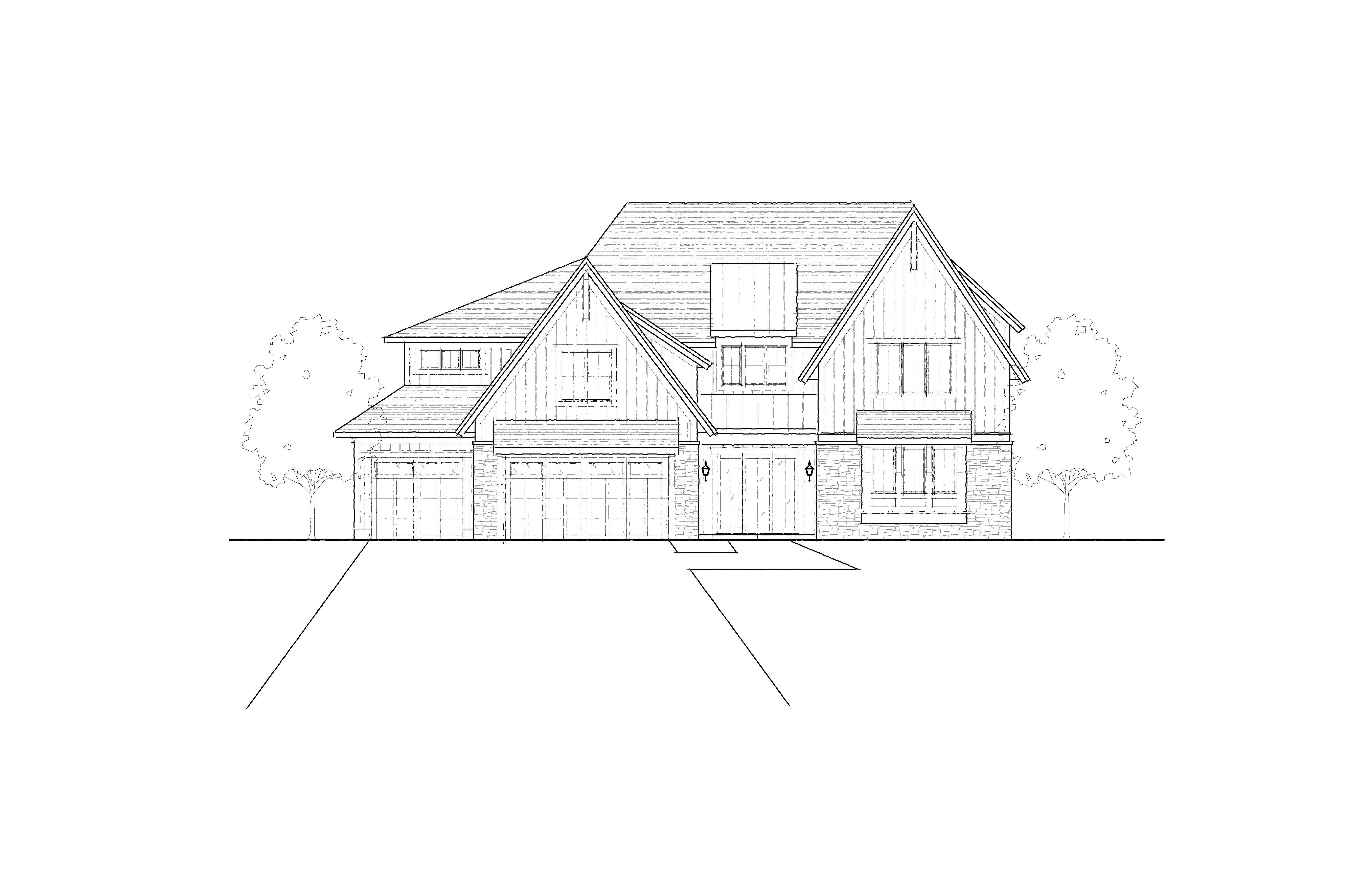 create a high end photorealistic 3d exterior architectural rendering based on the provided reference image maintaining the same architectural style proportions materials and evening lakefront setting with the following design modifications applied precisely massing changes pull the entire garage volume forward 20 feet so it clearly projects in front of the main house massing and the front porch keep the remainder of the house main living mass and porch set back relative to the garage projection maintain realistic roof transitions eave alignments wall offsets and structural logic after shifting the garage forward exterior materials remove all stone from the front facing gables replace stone at gable faces with vertical board and batten siding retain light stone veneer on the lower walls and garage surrounds only architecture materials unchanged unless noted two story modern craftsman transitional luxury home with multiple steep front facing gables warm greige vertical board and batten siding with complementary horizontal siding on secondary walls charcoal or dark bronze standing seam metal roof accents over the garage volume and select lower roof planes taupe architectural shingle roof above black or dark bronze window frames with tall clean proportions warm natural wood garage doors with subtle horizontal detailing and upper glass lites covered front porch with wood posts stone base columns and a warm wood front door site setting smooth light gray poured concrete driveway and sidewalks extending to the forward projected garage finished summer landscaping with lush green lawn ornamental grasses shrubs and small trees in full leaf calm natural lake in the background with soft reflections and distant tree line positioned naturally behind the home lighting mood early evening dusk lighting with a soft blue hour sky warm interior light glow visible through windows subtle exterior lighting at the entry and garage gentle reflections on metal roofing glazing and lake surface camera quality straight on to slightly angled front elevation at eye level accurate scale crisp materials balanced exposure and realistic proportions ultra realistic architectural visualization suitable for client presentation