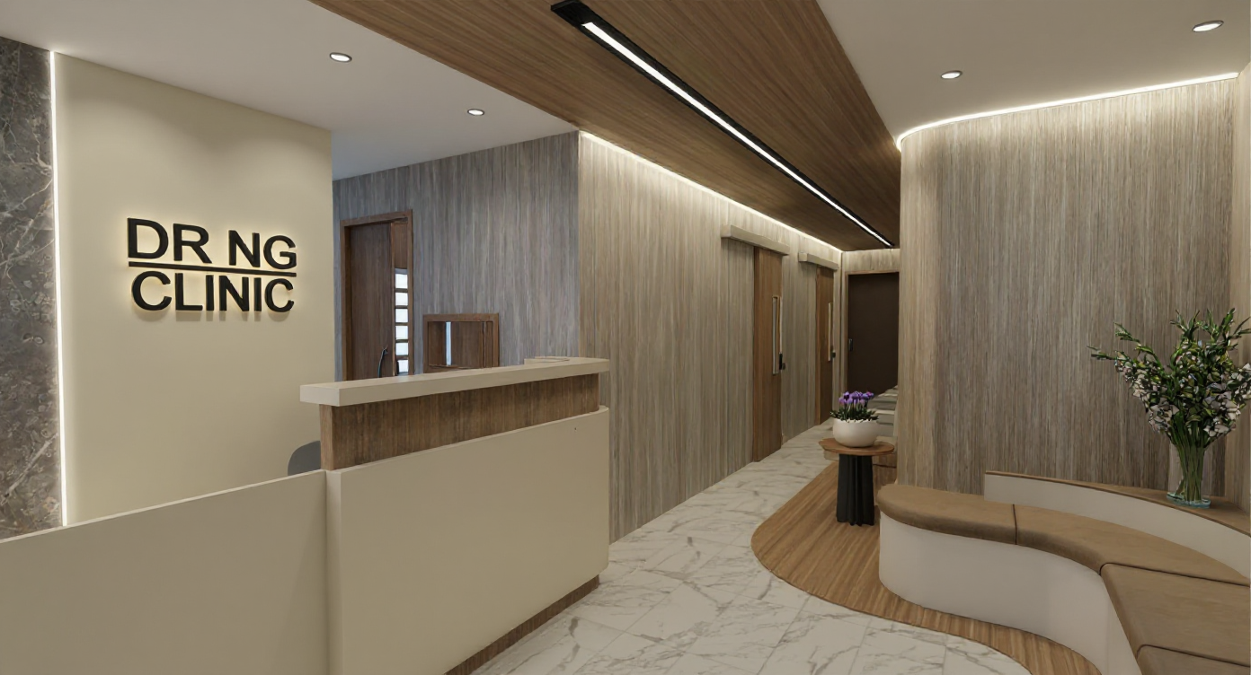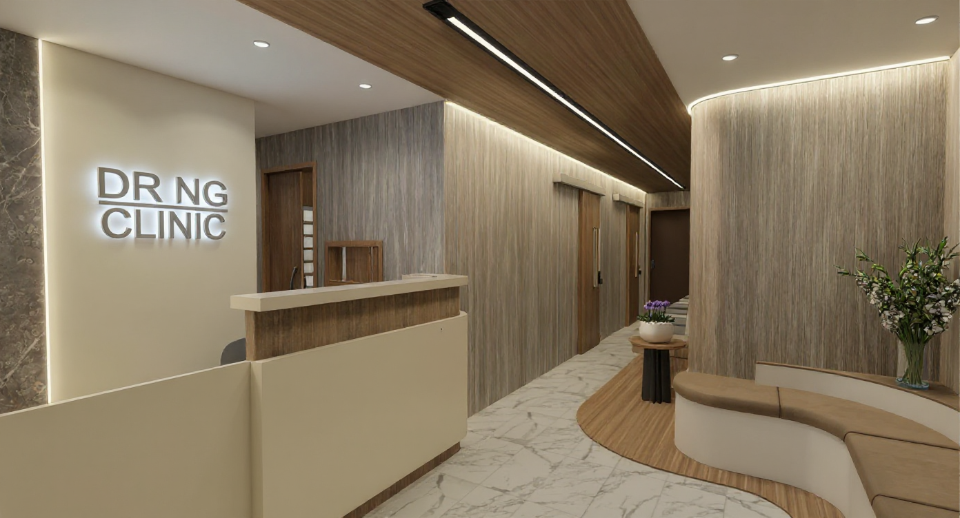 photorealistic image of well lit and clean interior of clinic maintain all materials and colours lights in 3000k dark brown back door dr ng clinic sign backlit