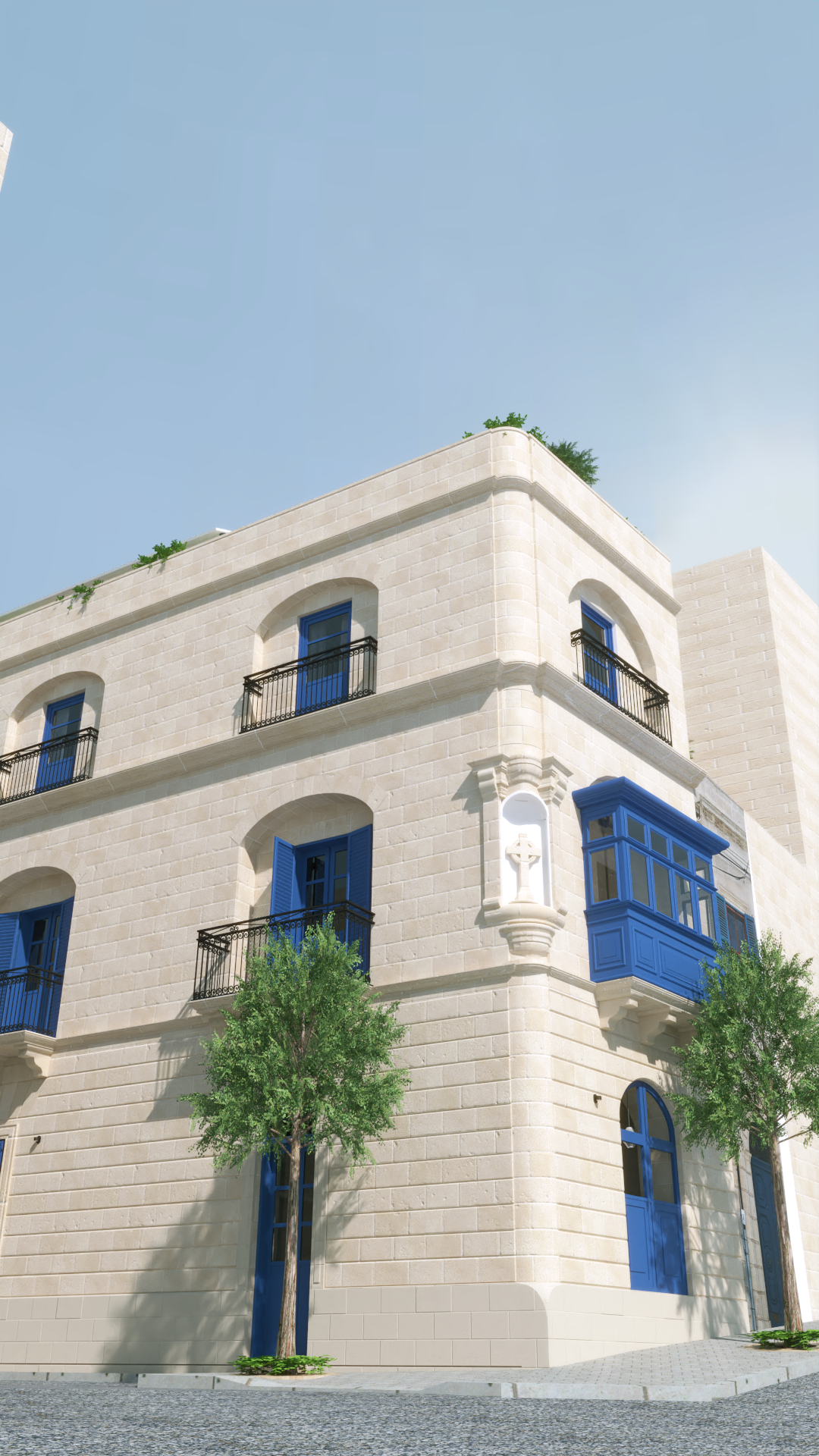 keep railing in black color and same shape keep apertures blue add few people on the corner is a statue of santa madonna carved in stone architecture
