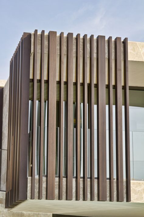 modernist exterior shot a stunning modern architectural facade with sleek vertical wooden slats in rich dark brown tones the background features large glass windows with a subtle reflection and smooth beige stone walls that add an element of sophistication the sky is a clear soft blue evoking a calm and serene atmosphere the overall mood is contemporary and elegant with clean lines and a harmonious color palette architecture