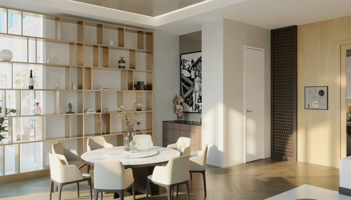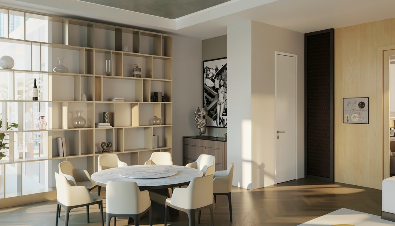prepare photorealistic render this dinning room open for kitchen do not change dimensions this dinning room got dimensions 5 x 5 5 m design there a table for 8 style modern classic light colours luxury style