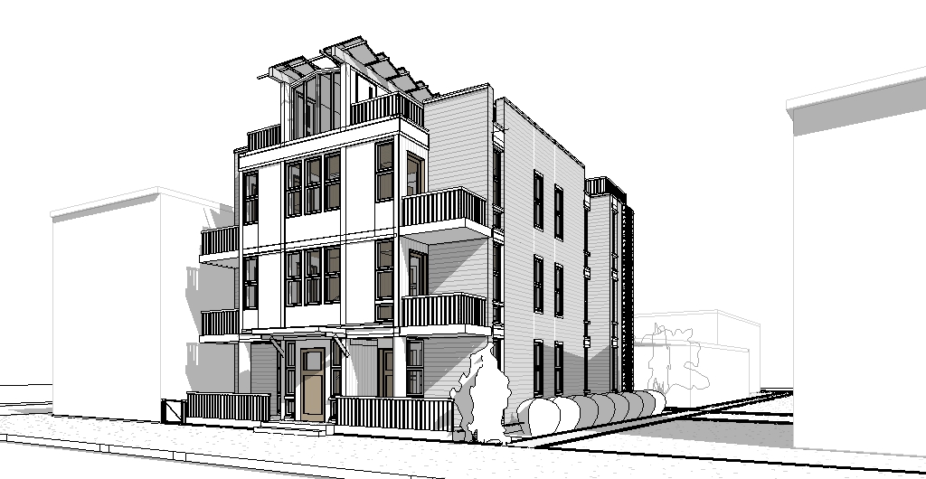 modernist exterior shot render a modern elegant three story building with a contemporary design surrounded by a lively urban atmosphere the building facade is painted in a soothing light gray with accents of white to highlight the trim and railings the balcony railings are in a sleek matte black providing a contrast to the facade large windows with reflective clear blue tint hint at the modern interior the entrance door a rich mahogany adds warmth and sophistication the atmosphere is sunny and vibrant capturing a bright blue sky with a few soft white clouds the surrounding pavement is a smooth light stone gray adding to the clean modern aesthetic architecture