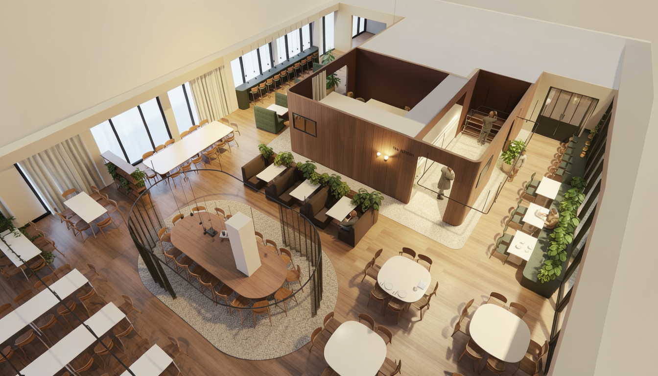 the atmosphere is and inviting use earthy tones for the wooden floors and tables the chairs are wallnut wood the walls are painted in soft cream complementing the light curtains the overall ambiance should feel welcoming and stylish
