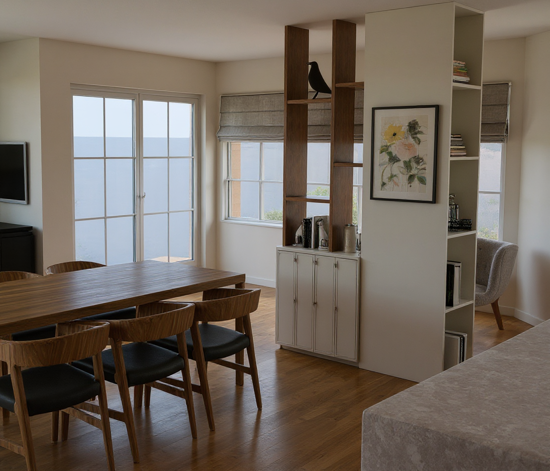 interior shot generate a high quality fully colored architectural floor plan based on the provided black and white construction plan do not modify the layout or room proportions keep the exact geometry of walls doors and openings style and presentation modern clean real estate marketing style soft color palette with warm neutrals light grays and subtle shading add depth with light shadows and gentle highlights clear room separation using soft background colors labels should be clean simple and minimal optional if the ai supports text avoid handwritten or distorted text flooring use light wood flooring for main living areas living room dining kitchen tile flooring in bathrooms laundry and entry carpet optional in bedrooms light beige furniture add realistic but minimal furniture living room sofa coffee table tv console accent chairs dining rectangular dining table with 6 chairs kitchen show the island with stools appliances and counters bedrooms beds queen in master twin or full in secondary nightstands closets office flex room desk chair shelving patio simple outdoor set optional colors materials neutral tones and warm accents white kitchen cabinets quartz style counters light gray walls to match the exterior style lighting effects soft realistic ambient lighting subtle drop shadows under furniture for depth clean high resolution finish camera composition top down orthographic view 90 no perspective distortion include entire plan with even margins on all sides center the house on the canvas goal create a beautiful easy to understand buyer friendly floor plan that looks like a professional homebuilder marketing sheet