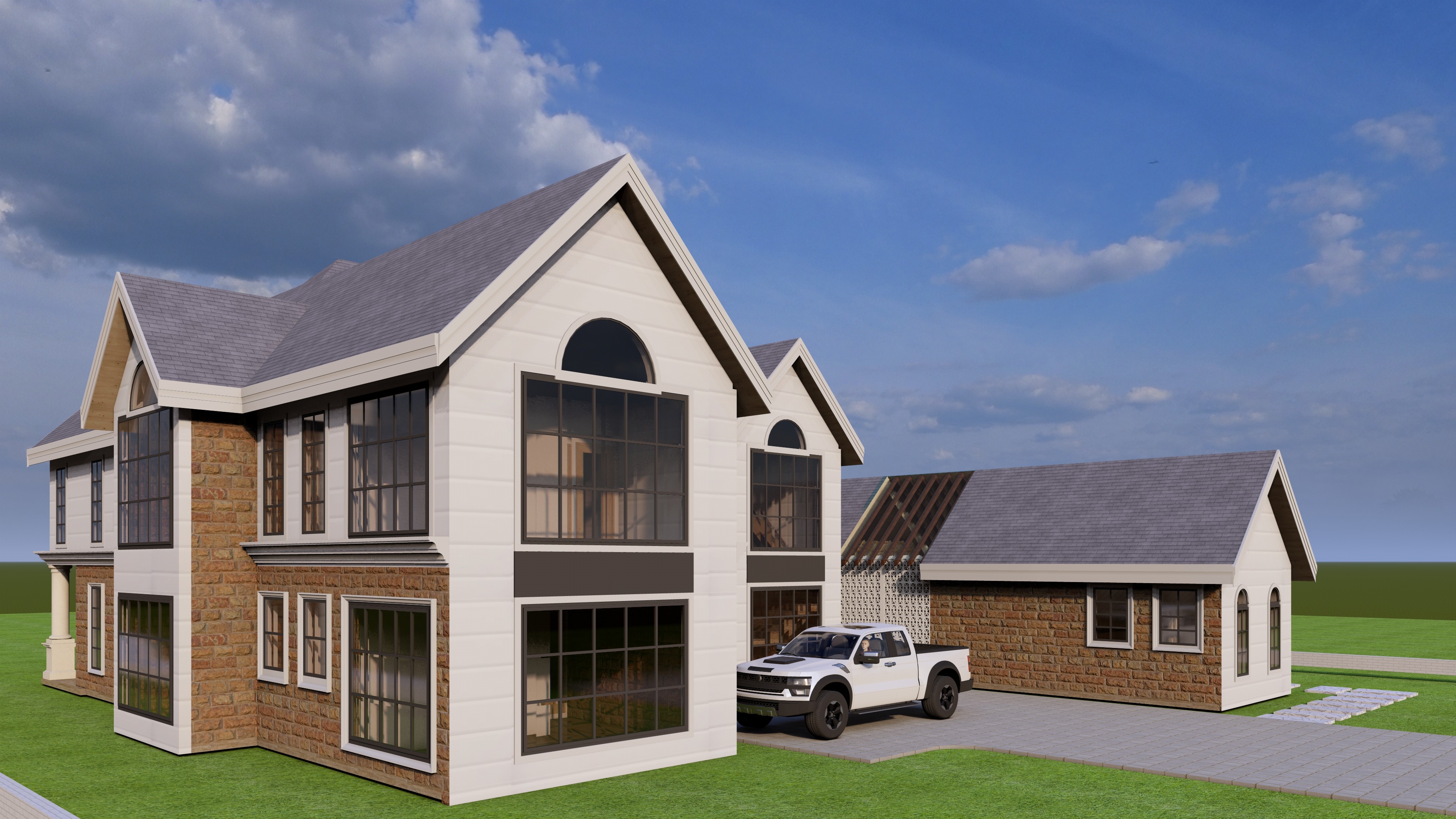 add few trees and vegetation for context all white walls white walls only must have horizontal key line pattern each spaced at 400mm vertically car must be a modern double cab