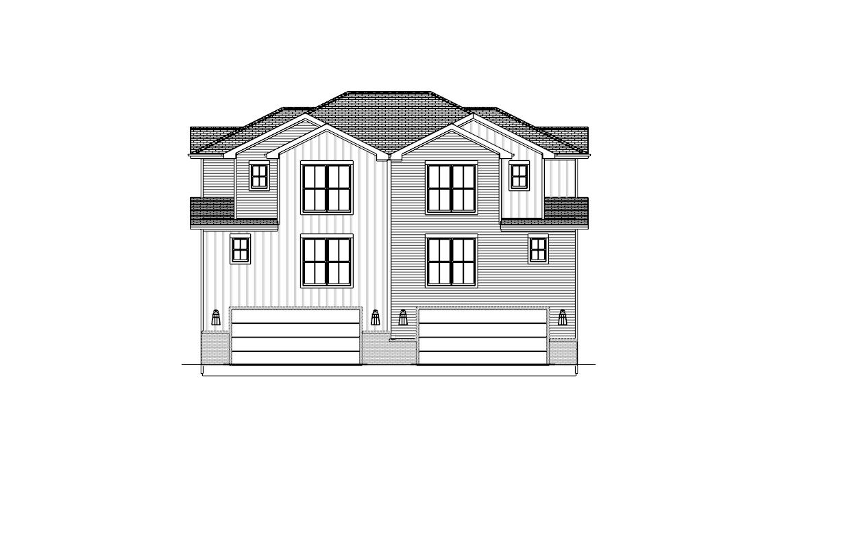 create a realistic scene from this exterior elevation add small plants that compliment the scene make the vertical siding a black board and batten siding make the horizontal siding a white lap siding do not change the materials make the brick black make the trim dark make the garage door black do not add architectural elements to the building