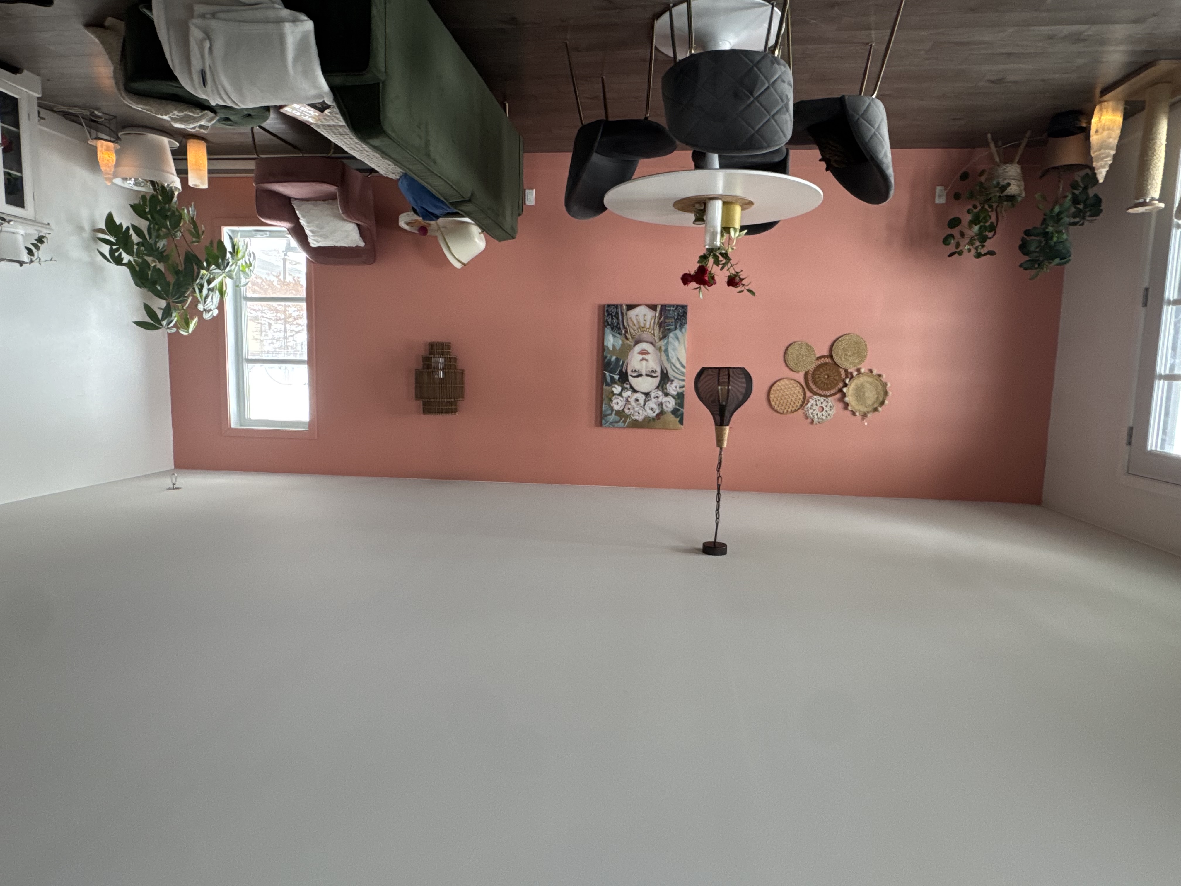change the pink wall for green one with wooden wall decoration