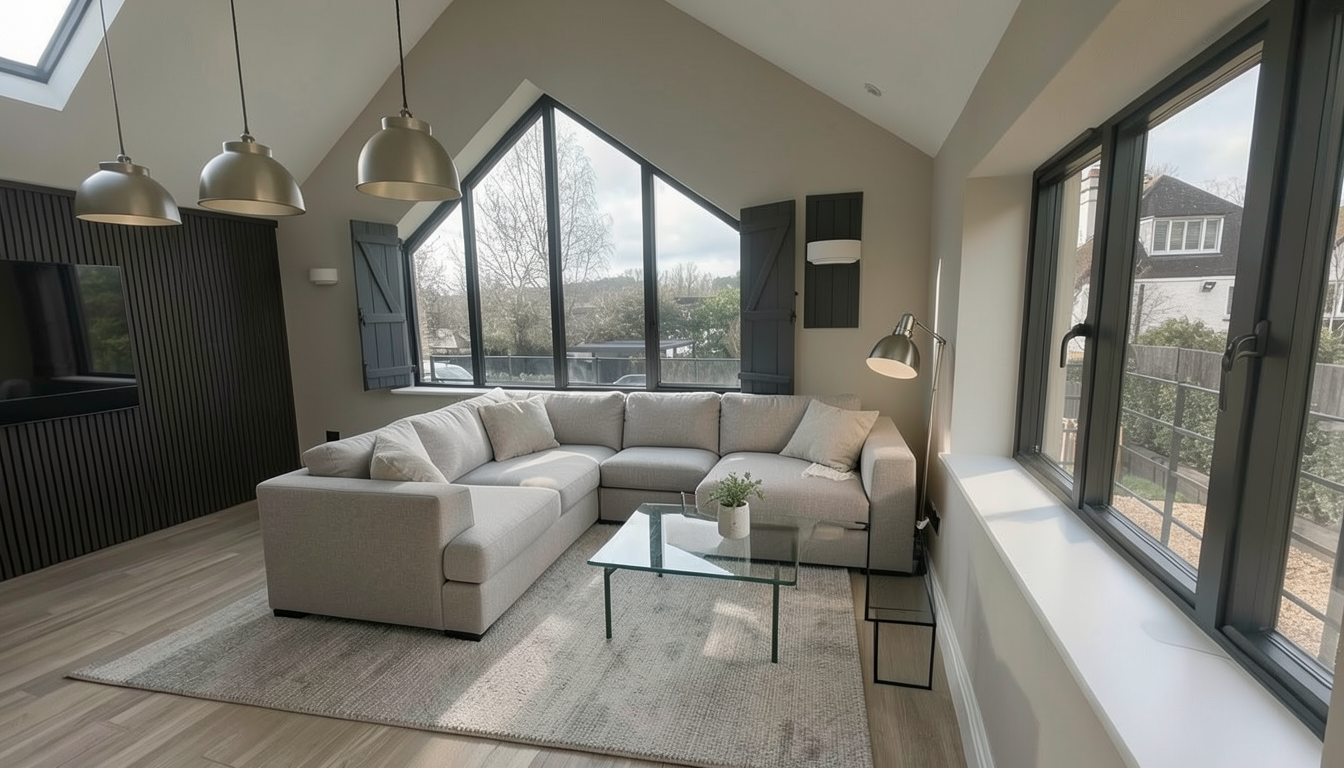 take this drawing which shows rear side side elevations and plan view and make a 3d render the side elevations only show a portion of the house as well as the plan view the building is of victorian edwadian era in the uk its has traditional red brick with lime mortar the windows of the house are white mainly sliding sash but with 2 large casement windows on the right hand side of the house under this windows are stone cills painted white there is no other stone on the property on the right of the house the wall is curved in a semi circle as shown on the plan view above the windows is a brick detail the conservatory has a brick dwarf wall and the rest is made of timber painted in farrow and ball elephants breath the cappings holding the glass inplace are lead to the left of the house is a brick wall with gates fpainted in farrow and ball elephants breath in front on the brick wall is some bushes and shrubbery the roof is slate with leaded hips there is a large overhanging soffit which is finished in cream ral 10 b 15 the house is set in the country with some tall trees in the back ground in front on the house is an indian limestone patio and then grass