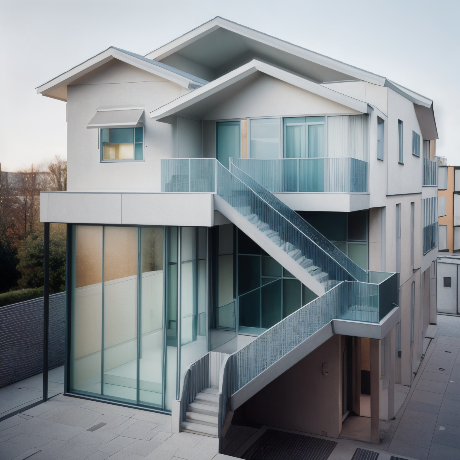 three story urban infill apartment in san diego california contemporary massing with boxy geometry and staggered fa ade rhythm match model s materiality and color palette smooth white and gray stucco horizontal wood siding and gold metal panels recessed balconies feature angular frames in bold sunset inspired tones muted orange coral mustard sage and slate blue maintain balcony projections framed windows and gold mesh shade panels as shown designed for walkability in a dense compact urban lot prioritize visual match to model s proportions textures and color blocking