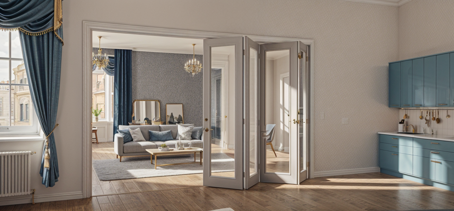 give this kitchen a modern update recreate blue grey colored cabinets with modern hardware and a backsplash that is modern but has a fun pattern give the image an overall warm atmosphere add items like a coffee maker and toaster to the counter to make the space appear homey add a door to hide the space in the back of the image
