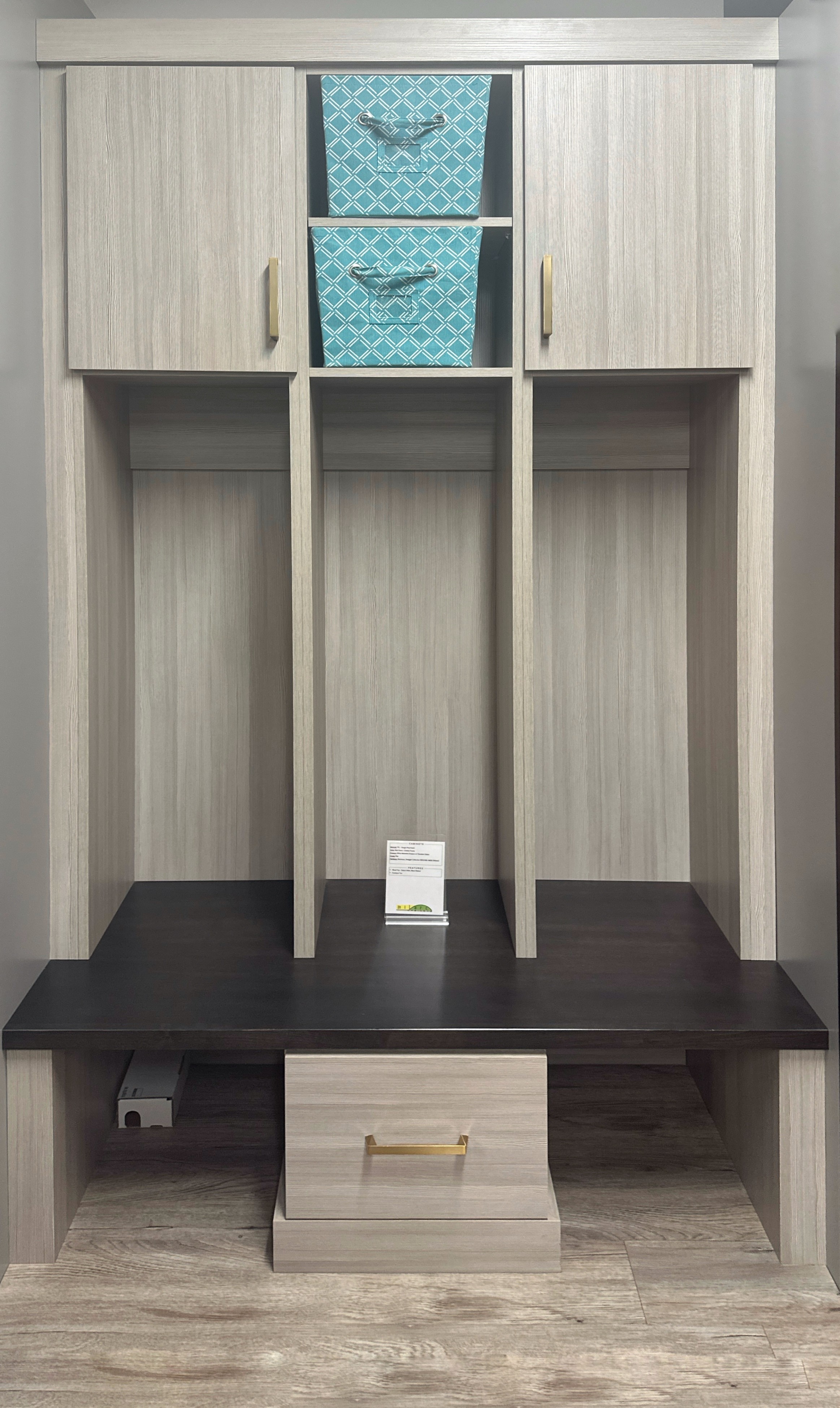 put this mudroom bench into a nice laundry room with coats hanging in the open lockers and shoes below the bench change the blue baskets to align with the scene do not change the cabinets at all