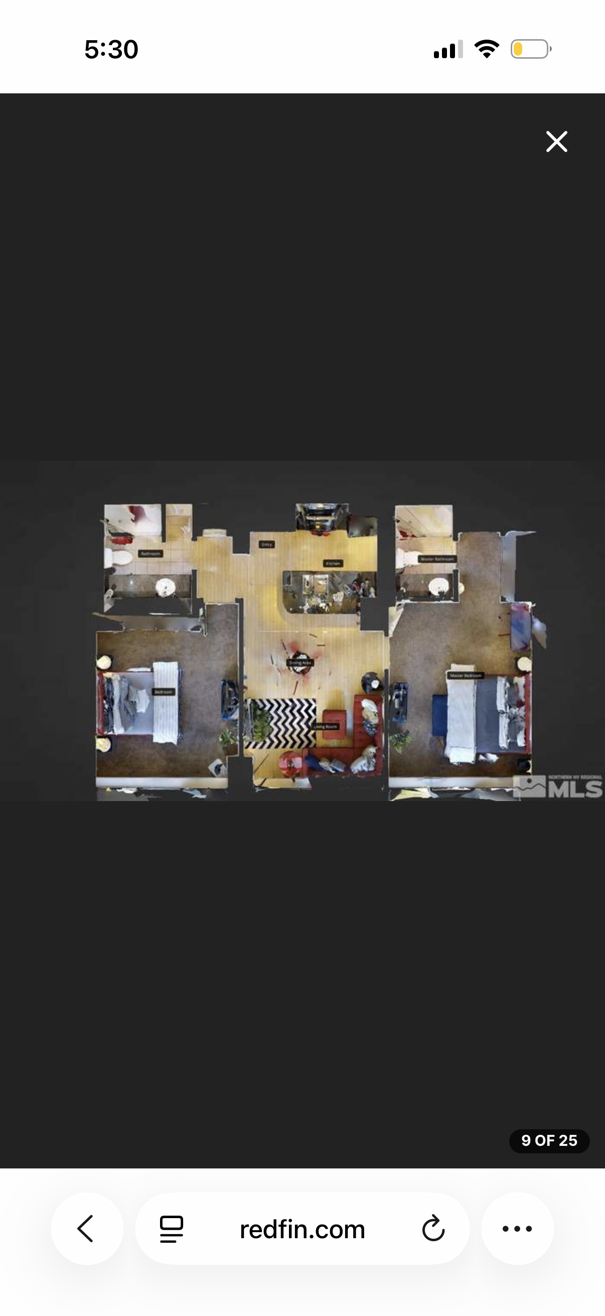 make this birds eye view into a 2d render cad file black and white and remove the rug keep the l shaped couch center the coffee table make arch room have the same shad of carpet countertops and bathrooms and kitchen s are dark colored remove the dining table keep beds and bed side tables make the bathroom counters accurate and closets accurate