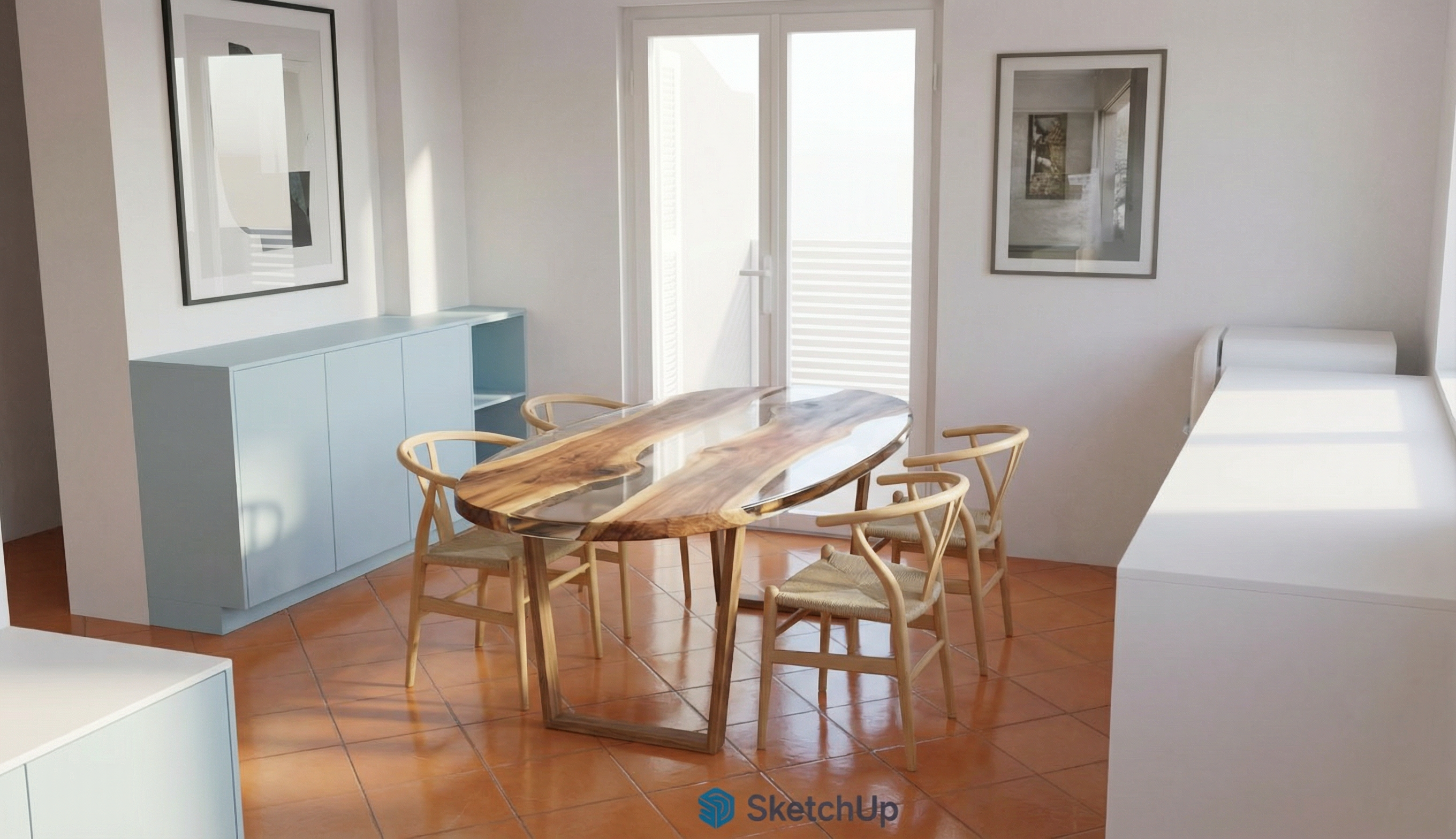 add smaller oval massive epoxy dining table with 4 white or light wooded chairs picture on the left wall and one more on right of the balcony door rotate dining table for 90 from previous picture dressers can be light blue white or light wooden tiles are a little bit more orange but not too orange remove logo