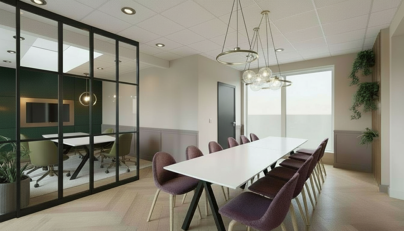 use the uploaded image as the only structural reference do not change composition layout proportions ceiling perspective camera position lighting direction or spatial relationships no objects may be moved resized added or removed only replace materials and finishes as specified below transform the image into a high end photorealistic interior visualization with refined textures realistic daylight and accurate material expression apply the following material and product specifications walls wallpaper lynn by arte herringbone floor warm natural oak tone as shown in reference image wainscoting lambrisering soft taupe tone harmonizing with arte lynn wallpaper right table white tabletop with black legs chairs around right table johanson atticus chairs aubergine fabric upholstery wooden legs left table chairs dalia office chairs with olive green leather seat and bronze base tv wall dark green wallpaper casamance saiho frame behind tv bronze finish pendant above right table metallux orbita pendant above left table metallux libra with 4 glass spheres doors and frames little greene attic 2 vertical slats with integrated planting bronze finish maintain a calm hotel chique atmosphere with realistic material depth subtle reflections accurate fabric textures natural bronze sheen and soft diffuse daylight no redesign no reinterpretation material update only