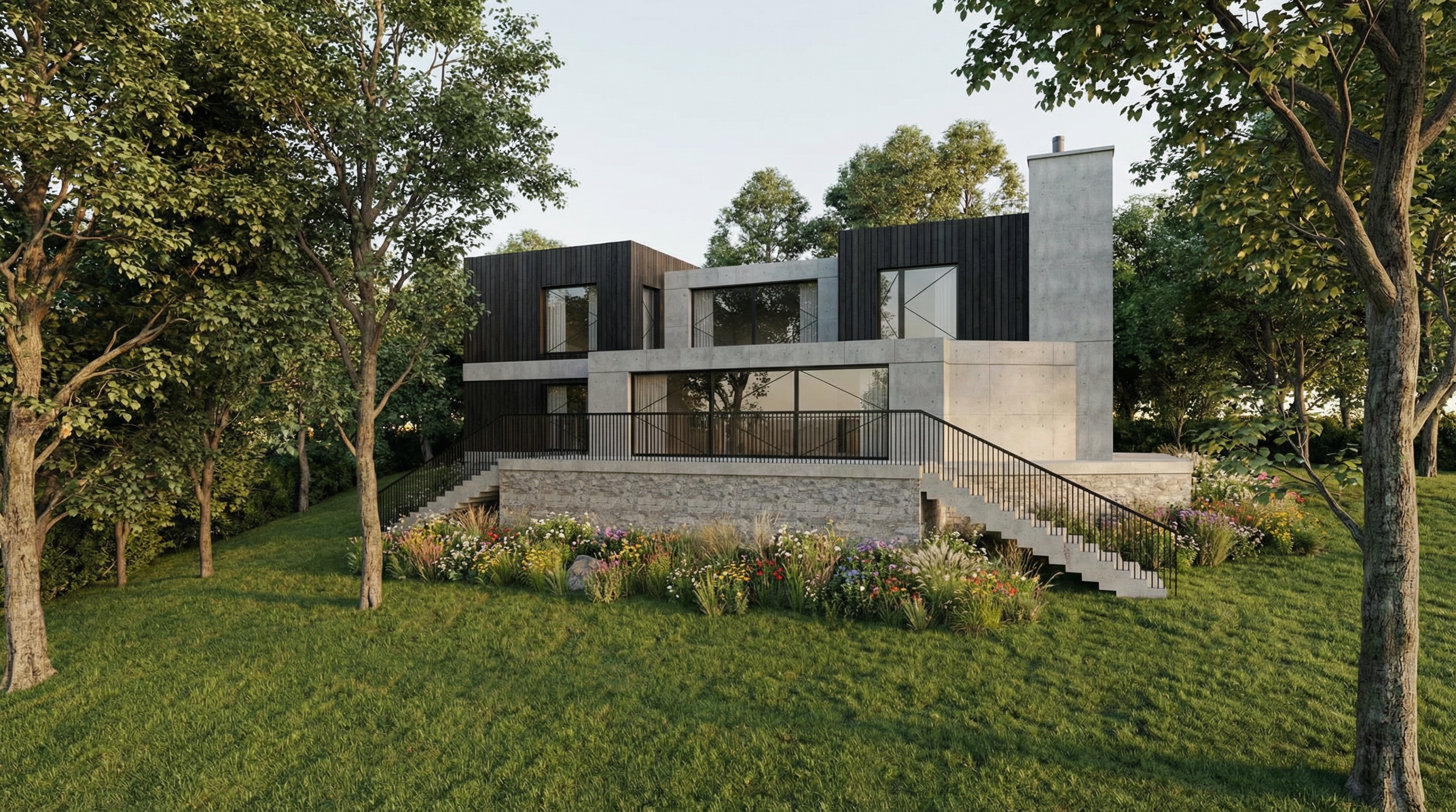 black weatherboard cladding black roof black window frames remove vertical post in corner sliding door lawn low timber decks extensive native planting background trees sunset