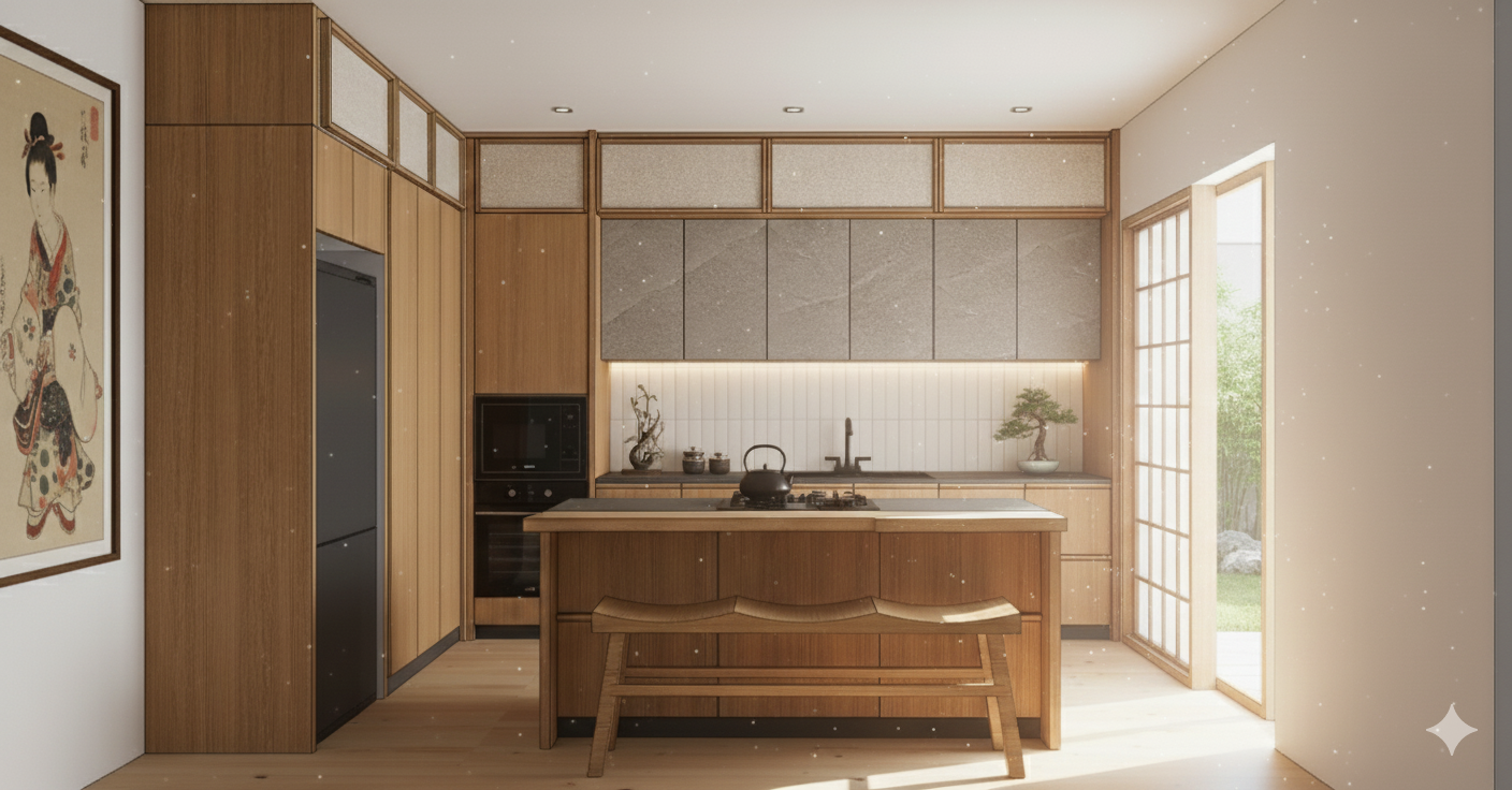 render a serene and elegant kitchen in a japanese minimalist style emphasize warm natural wood tones for cabinets and floors paired with light gray stone textures for the upper cabinets use soft ambient lighting to create a calming atmosphere include a large window for abundant natural light casting soft shadows the walls should be a subtle off white and incorporate a traditional japanese art piece for cultural depth add a touch of greenery like a small bonsai for a fresh accent the overall mood is peaceful and harmonious make satin