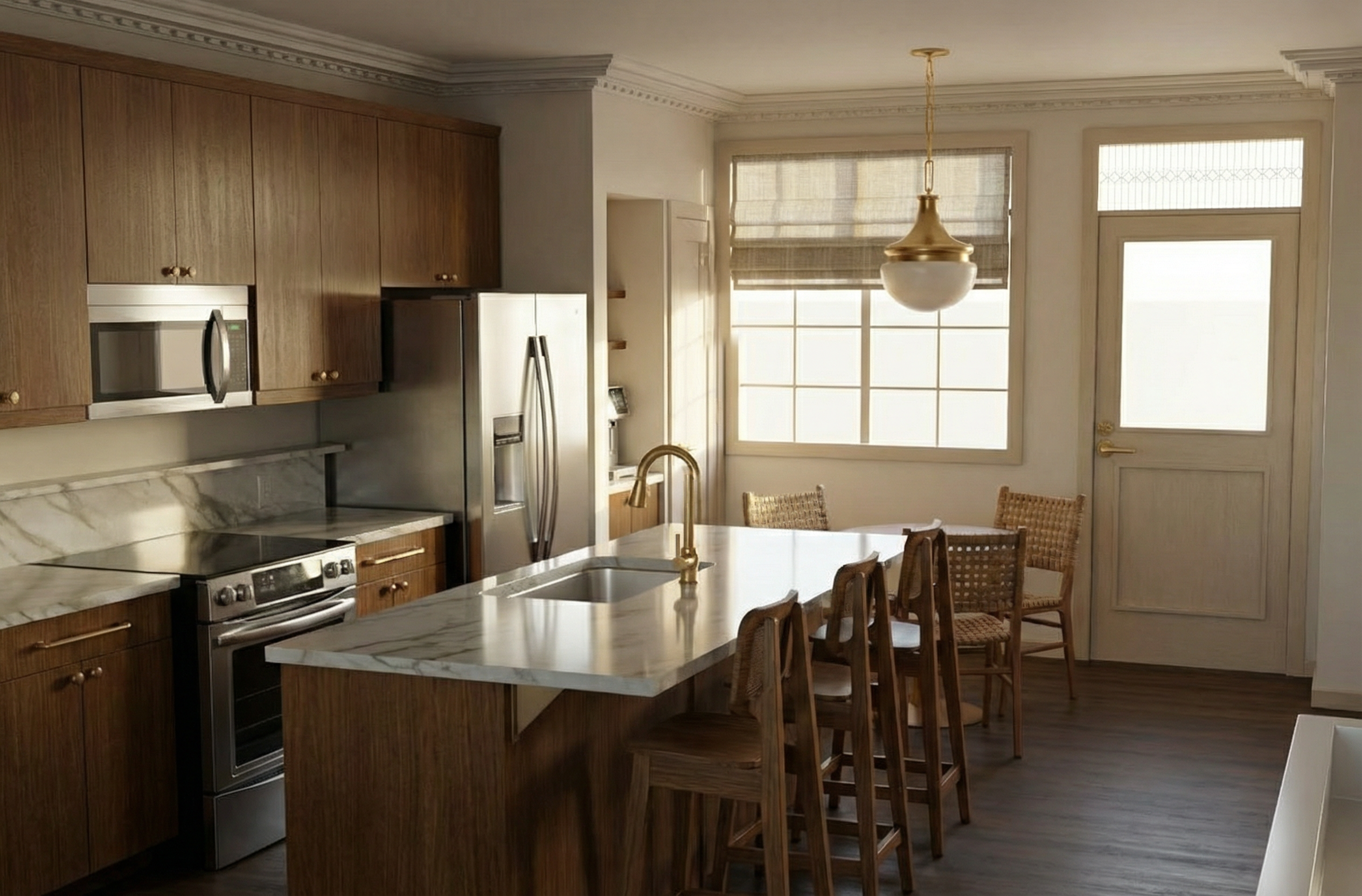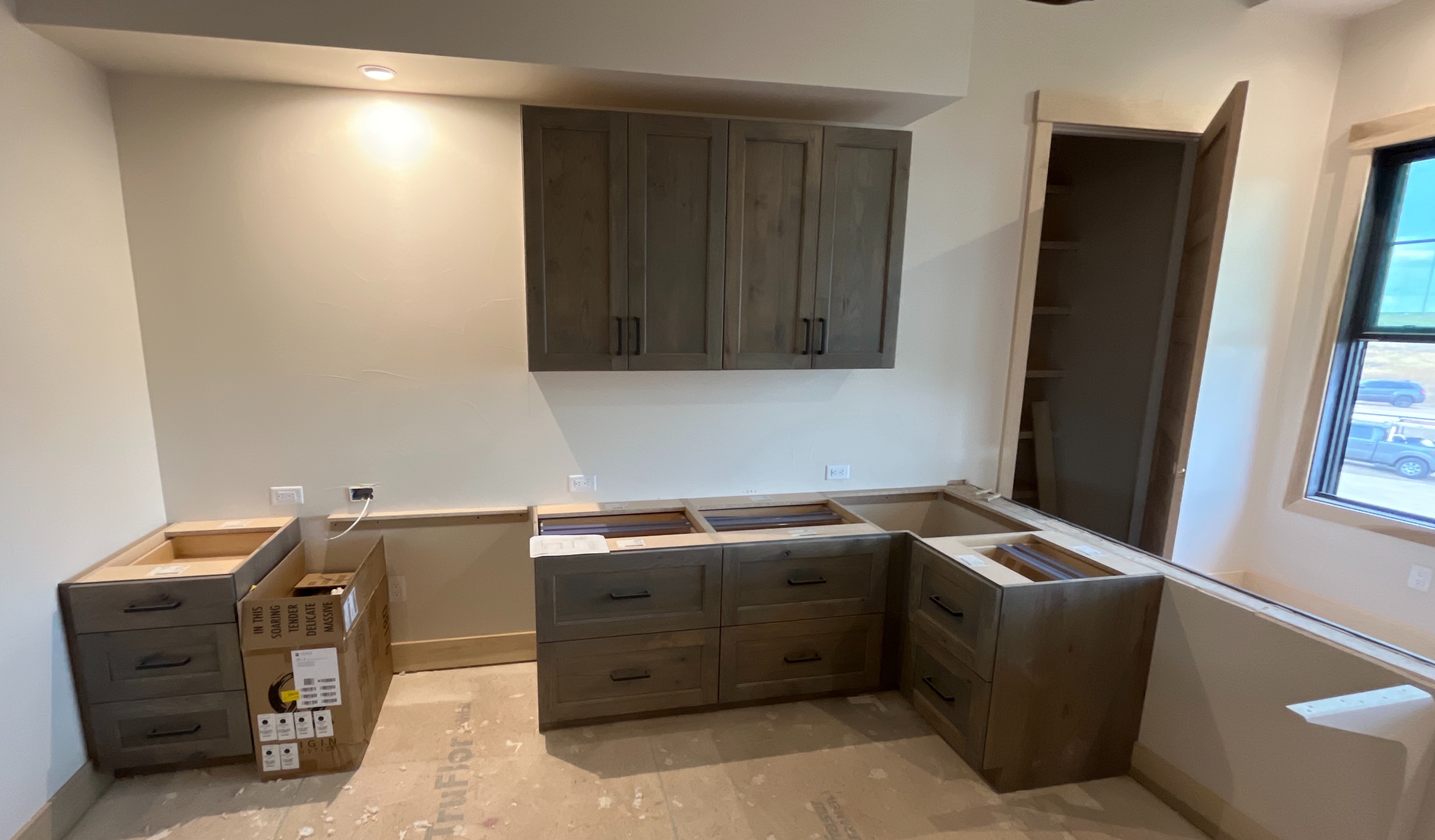 do not change the cabinets in any way preserve the exact cabinet colors materials finishes dimensions door and drawer styles hardware spacing alignment and all geometry exactly as shown do not alter the countertop shape backsplash appliances flooring lighting fixtures or wall structure only remove the construction materials clutter and mess from the scene clean the room and make it look finished and staged add a few simple tasteful home accessories appropriate for the style of the space but do not add or remove any furniture windows or architectural elements maintain the original lighting direction and realism enhance clarity and polish the photo while keeping the cabinetry and room design completely unchanged do not alter the lighting to keep the cabinet colors as they are in the image add new flooring and countertops add crown molding to the upper cabinets stage for a home office including a chair add a simple field view out the window change the door to a patio door remove the antlers